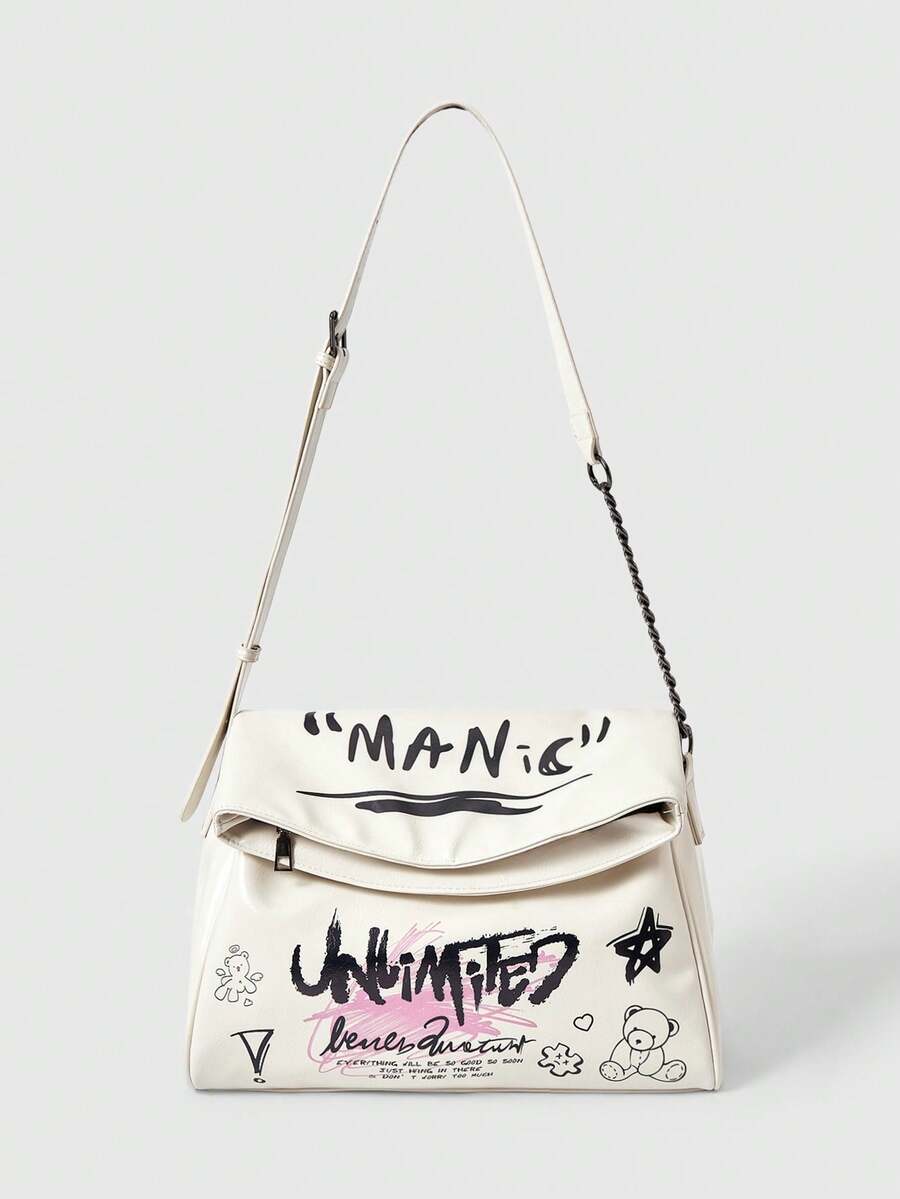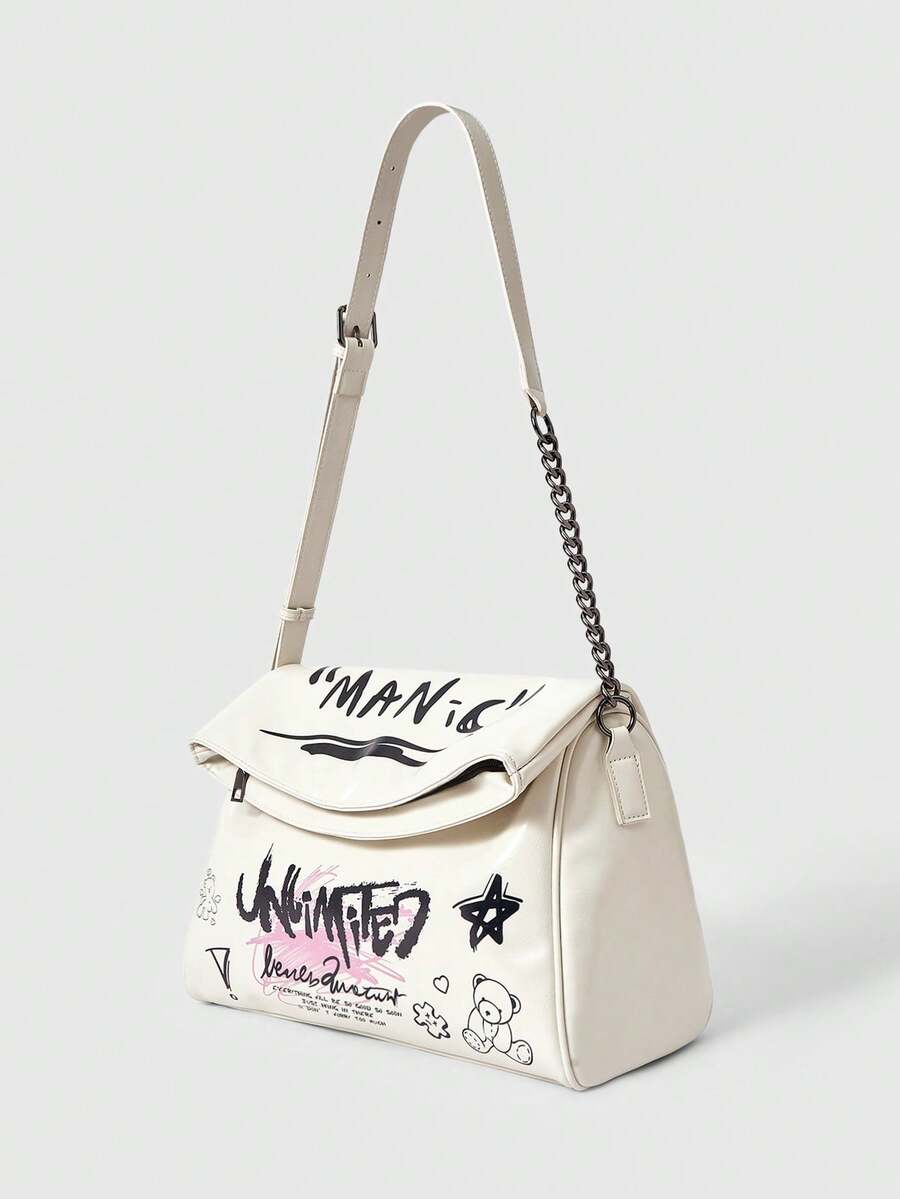Grunge Punk Borsa a tracolla da donna in PU con graffiti di lettere alla moda e catena, stile street