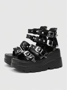 Grunge Punk Sandali alla moda da donna, con design della fibbia in metallo, punta aperta, suola spessa, tacco basso 7,5 cm, in pelle PU retrò nera, adatti per uscite estive e appuntamenti