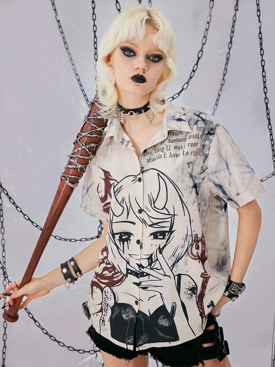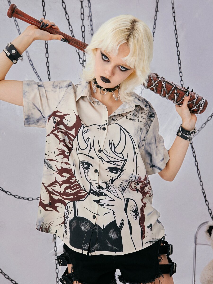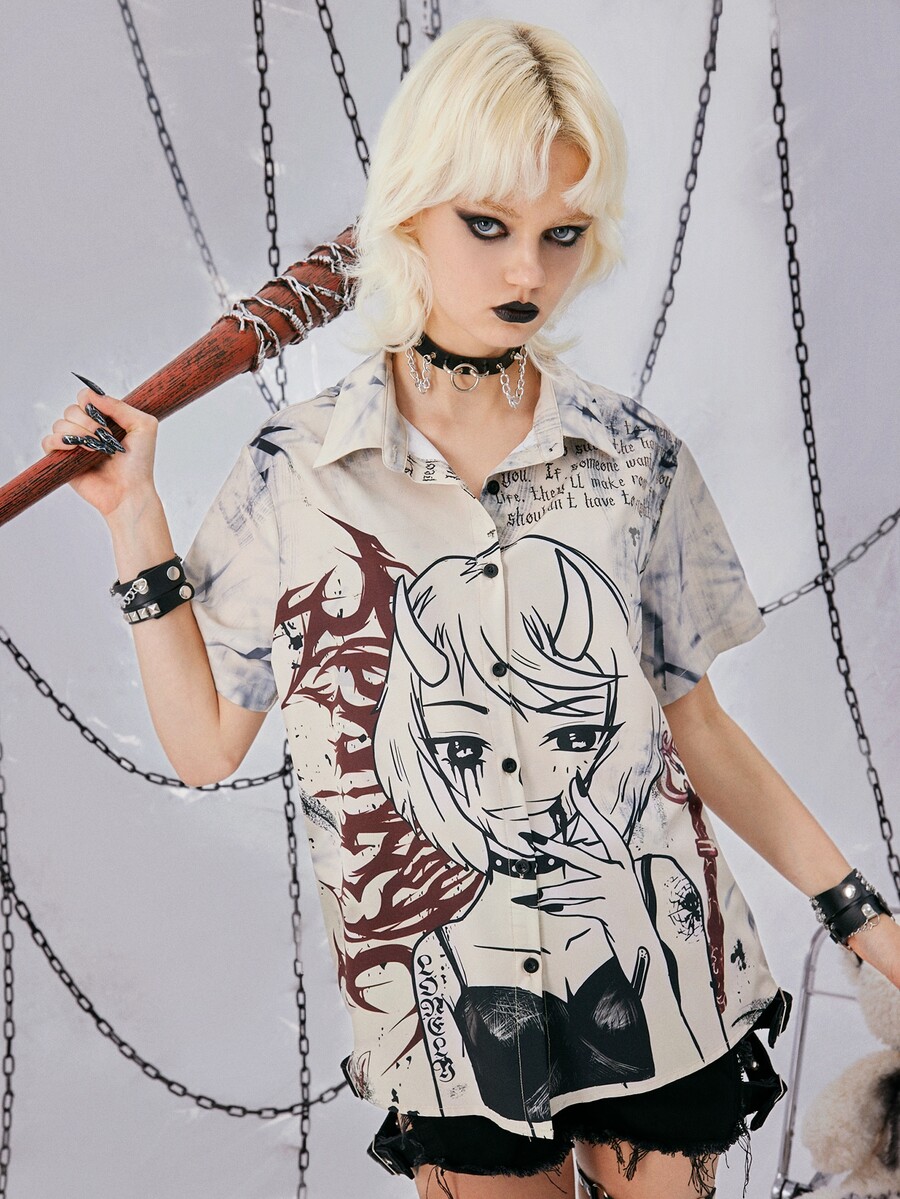 Grunge Punk Camicia con stampa figura con bottone frontale
