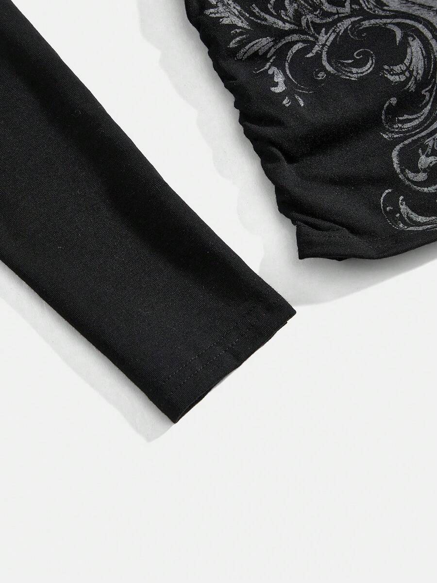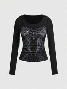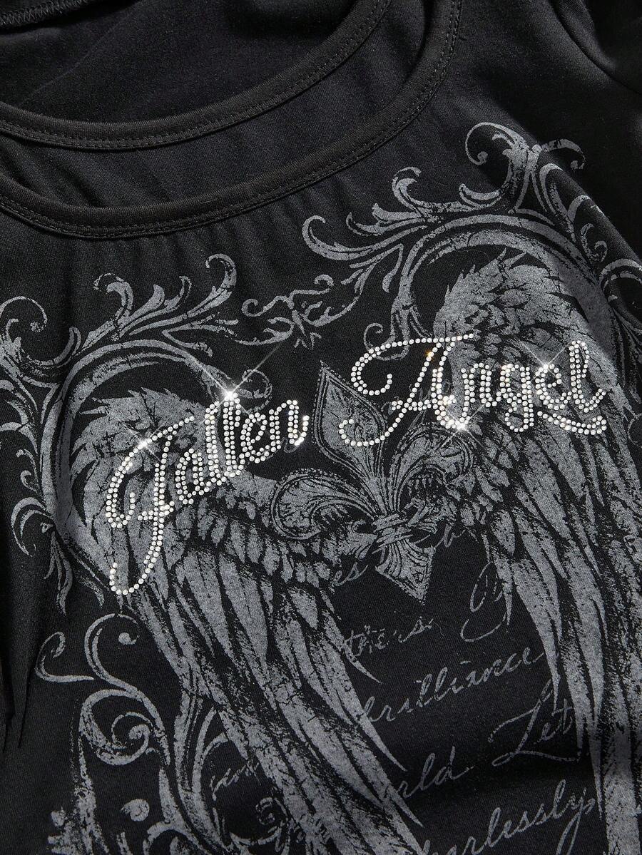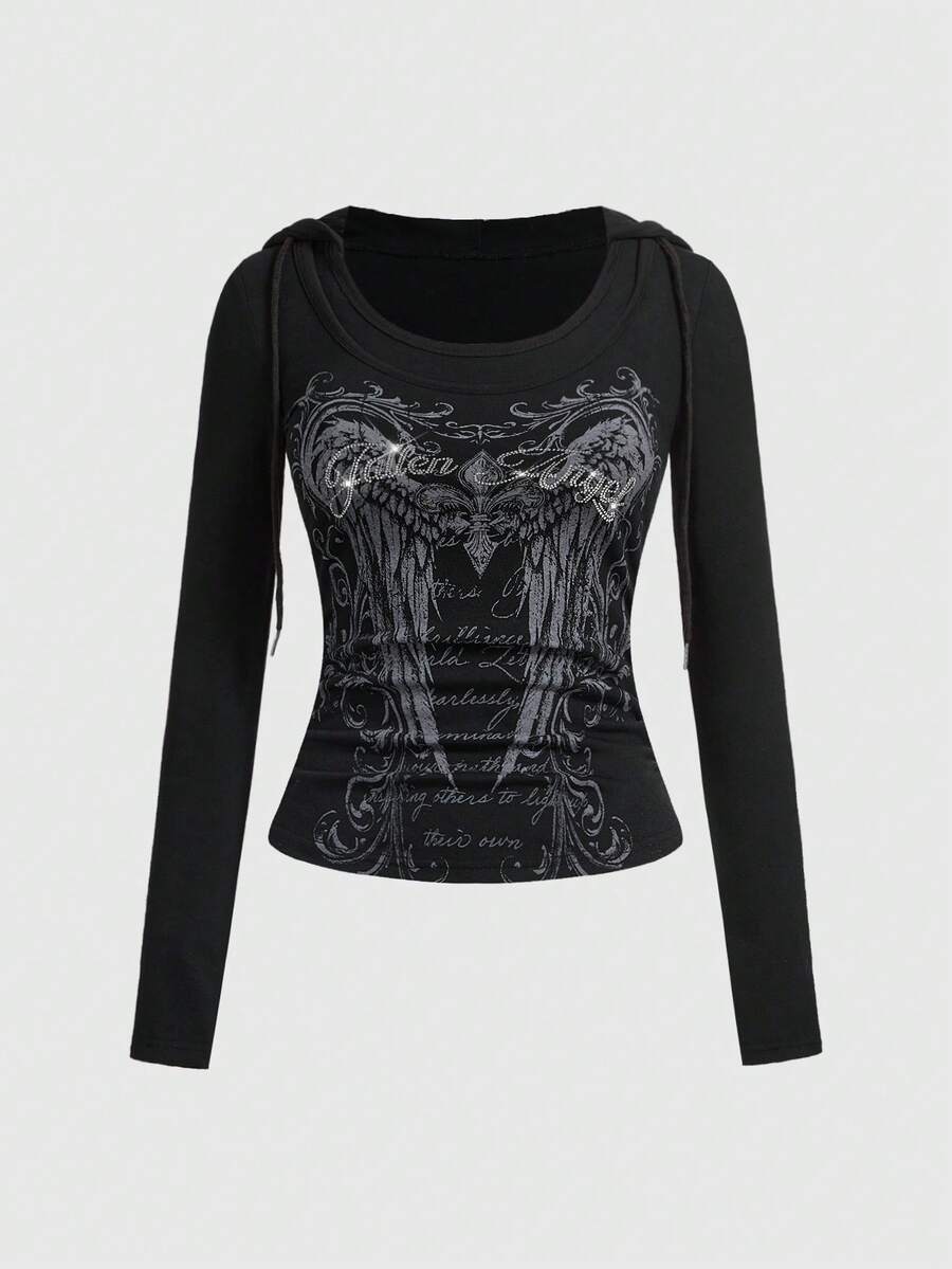 Grunge Punk Maglietta con cappuccio da donna in stile grunge, con stampa di ali e decorazioni di strass