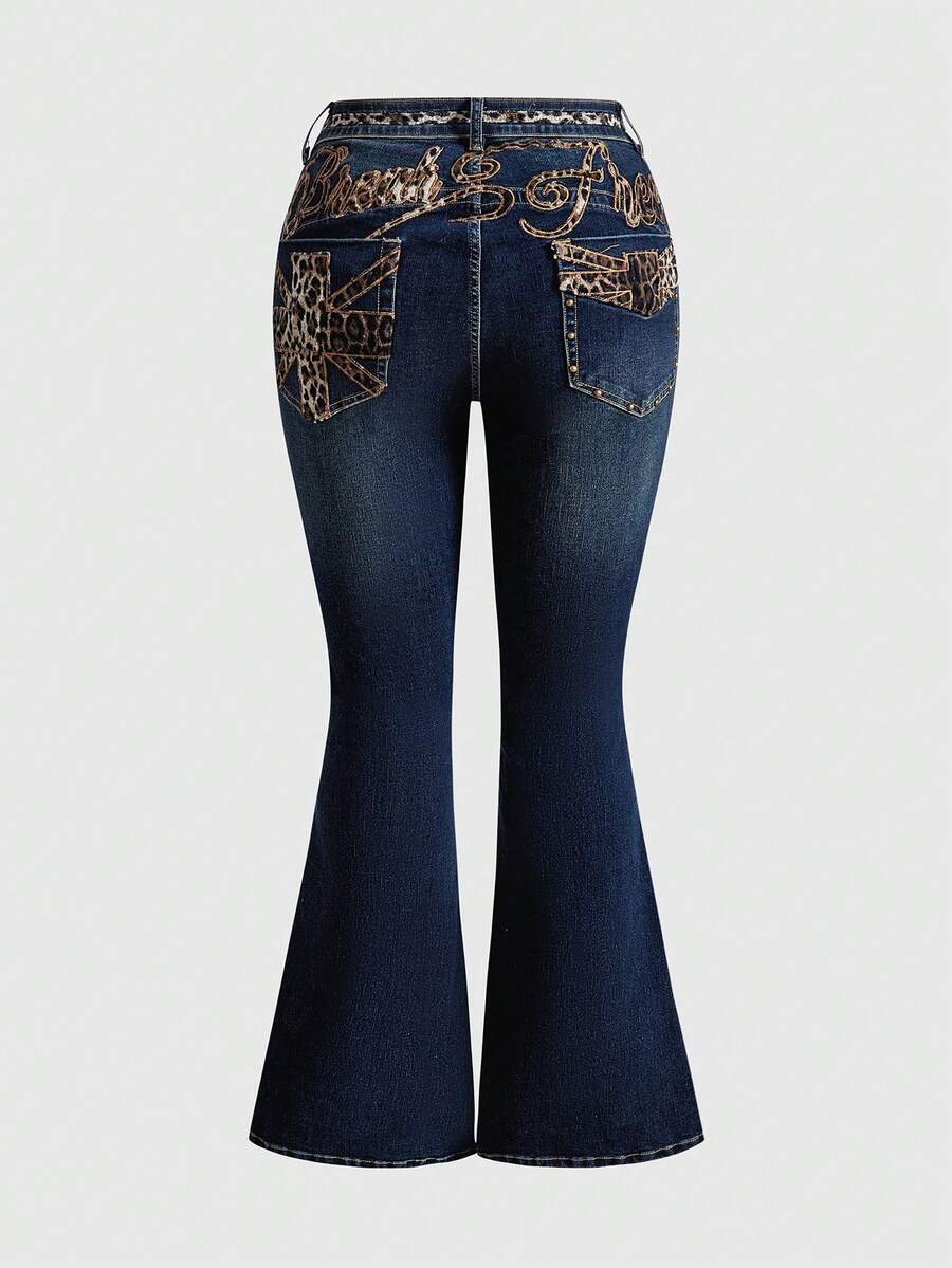Grunge Punk Jeans casual da donna con stampa leopardata, ricamo di lettere e decorazioni in stile grunge-punk, jeans di taglia grande in denim lavato blu per autunno/inverno, jeans a zampa stile punk rock Y2K