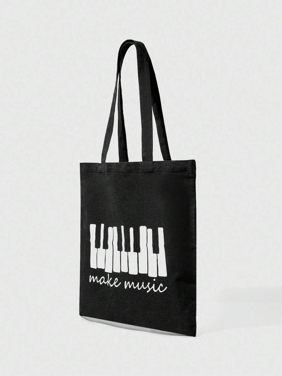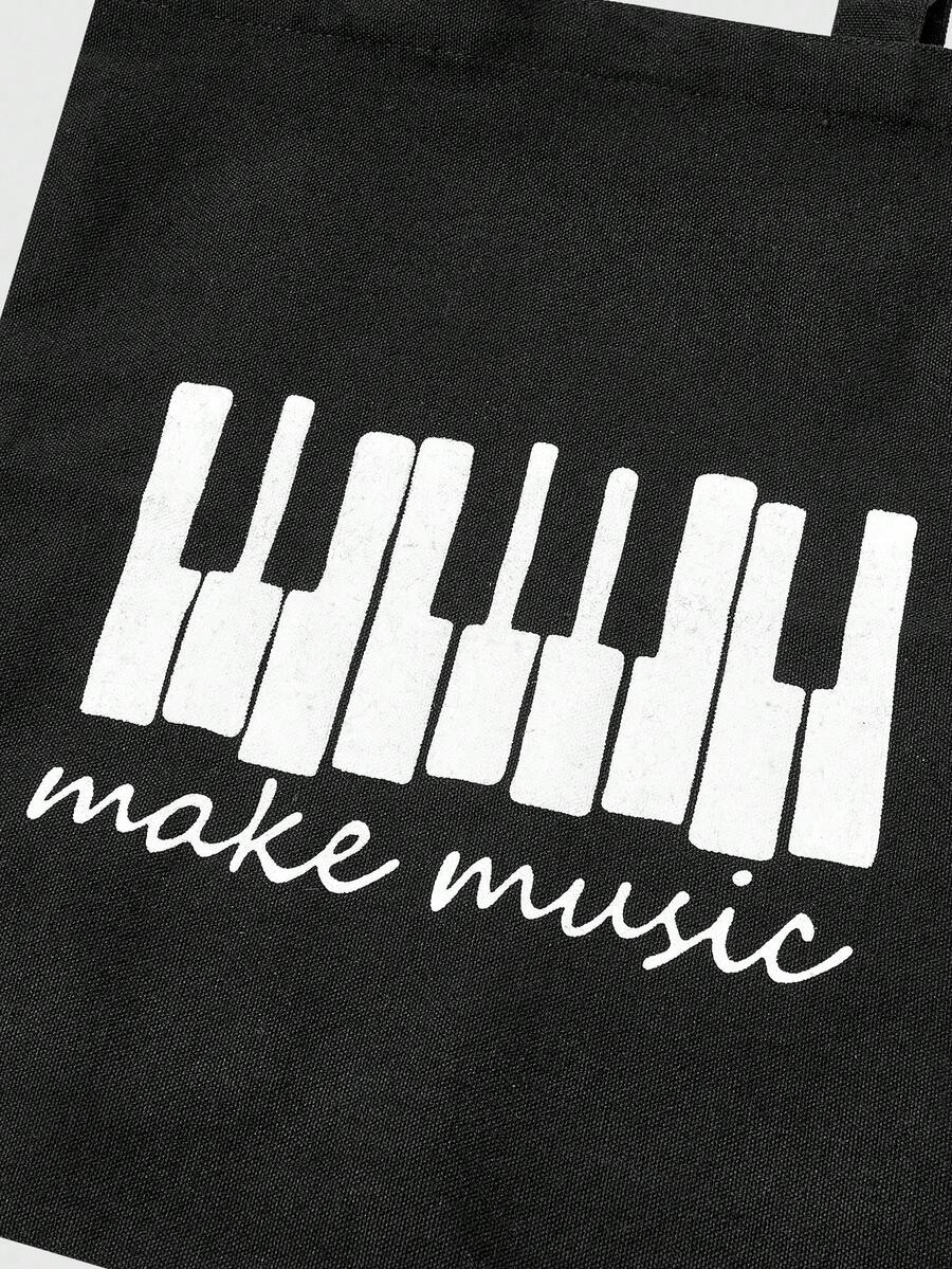 Grunge Punk Borsa a tracolla di grande capacità con stampa minimalista di elementi musicali e lettere di pianoforte in nero, casual e versatile per pendolarismo, adatta per scuola, shopping, uscite, feste, unisex