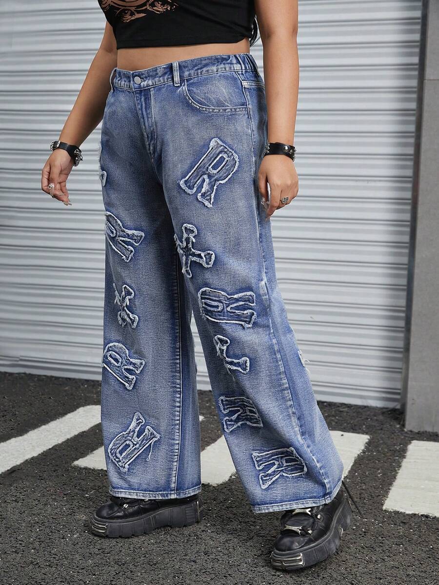 Grunge Punk Taglie Forti Jeans con toppa lettera gamba ampia