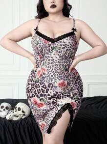 Grunge Punk Camicia da notte oversize con stampa leopardata e pizzo a contrasto con rose