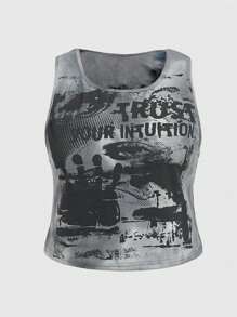 Grunge Punk Top a canottiera a costine con stampa grafica di occhi e mani, legata, per taglie grandi, per la scuola