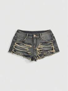 Grunge Punk Shorts di jeans asimmetrici a vita bassa con design consumato per taglie forti, adatti per concerti
