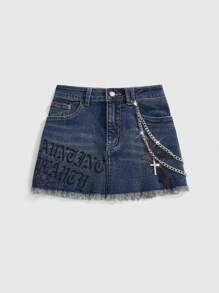 Grunge Punk Minigonna in jeans bassa vita con slogan gotico sexy, ragnatela e dettagli in PU a forma di croce, per donne, stile Y2K