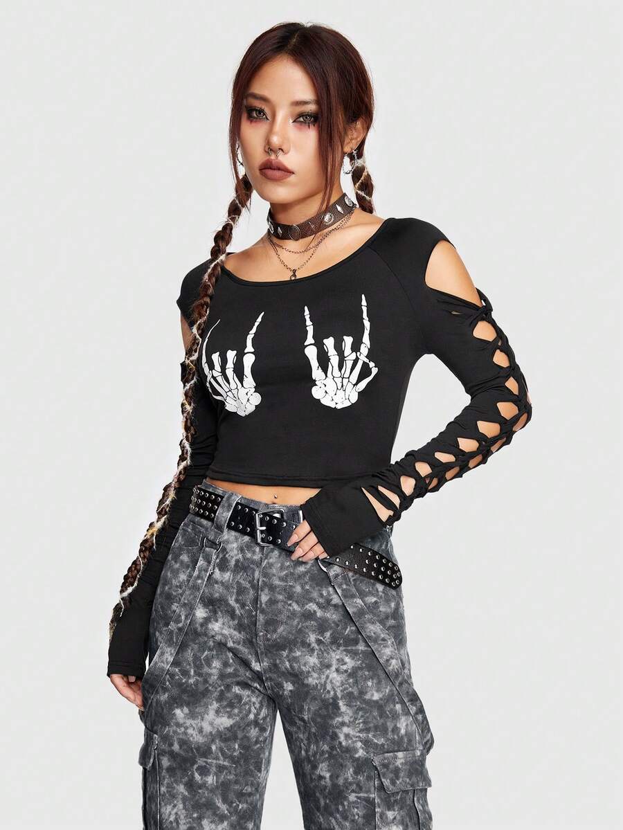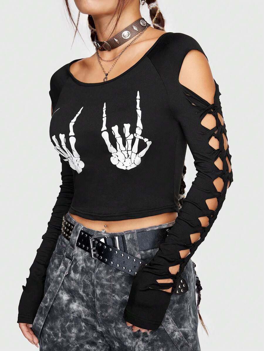 Grunge Punk Maglietta scheletro con stampa mano scavato