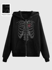 Grunge Punk Felpa con chiusura lampo e strass a forma di scheletro e cuore, per la scuola