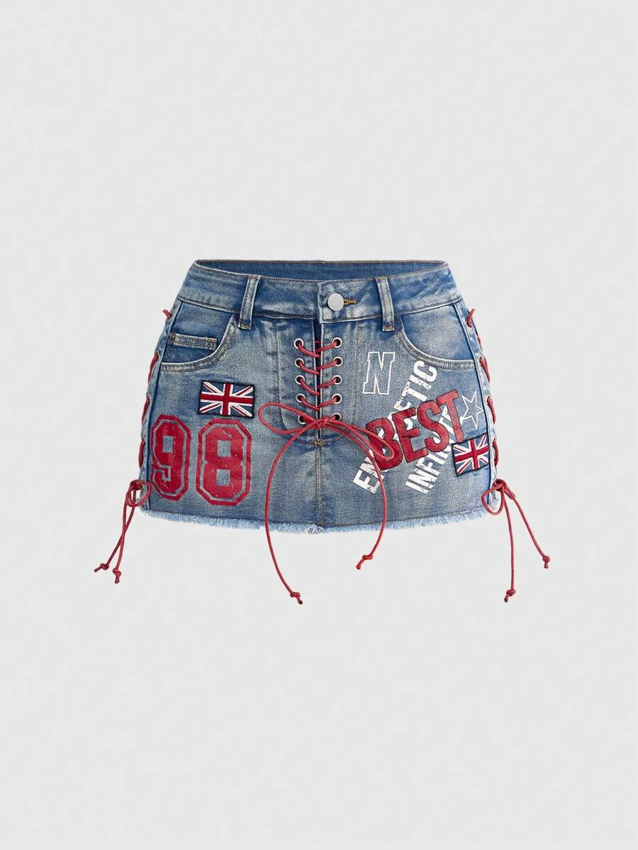 Grunge Punk Minigonna aderente in denim con vita super bassa, design con coulisse e toppe a contrasto con stile bandiera del Regno Unito