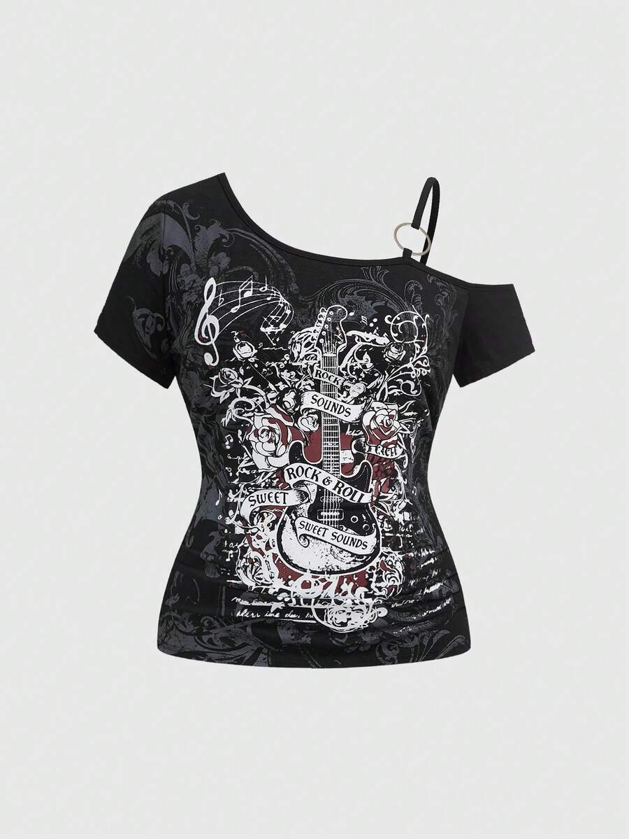 Grunge Punk T-shirt nera a maniche corte aderente con motivo asimmetrico a pentagramma e note di chitarra in stile grunge-punk, taglie forti