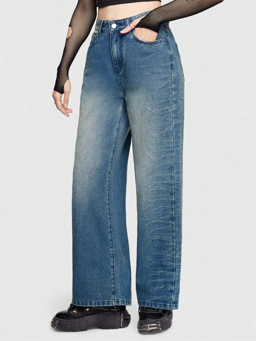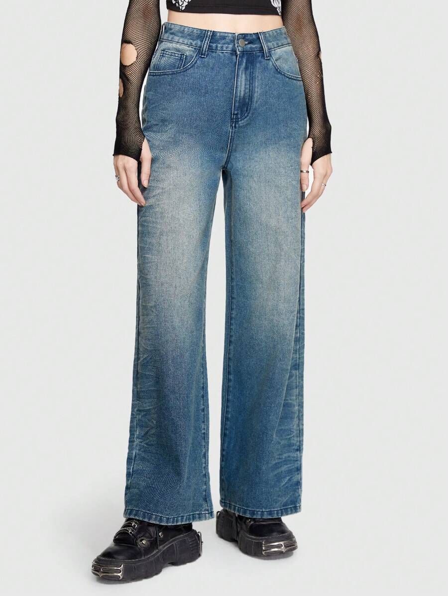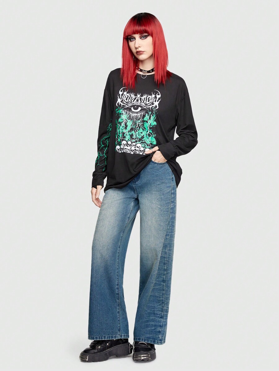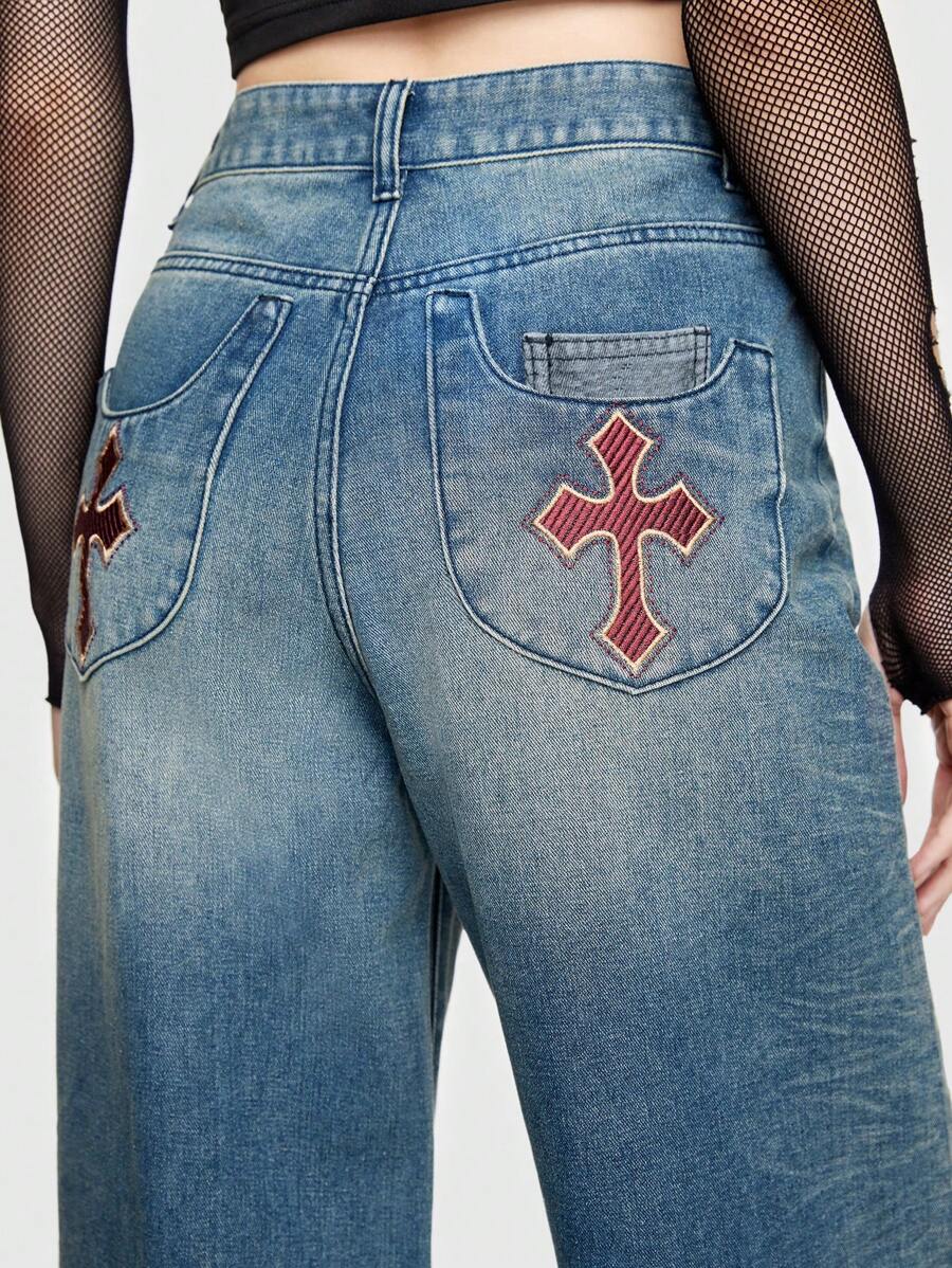 Grunge Punk Jeans In Denim A Gamba Dritta Con Stampa A Croce