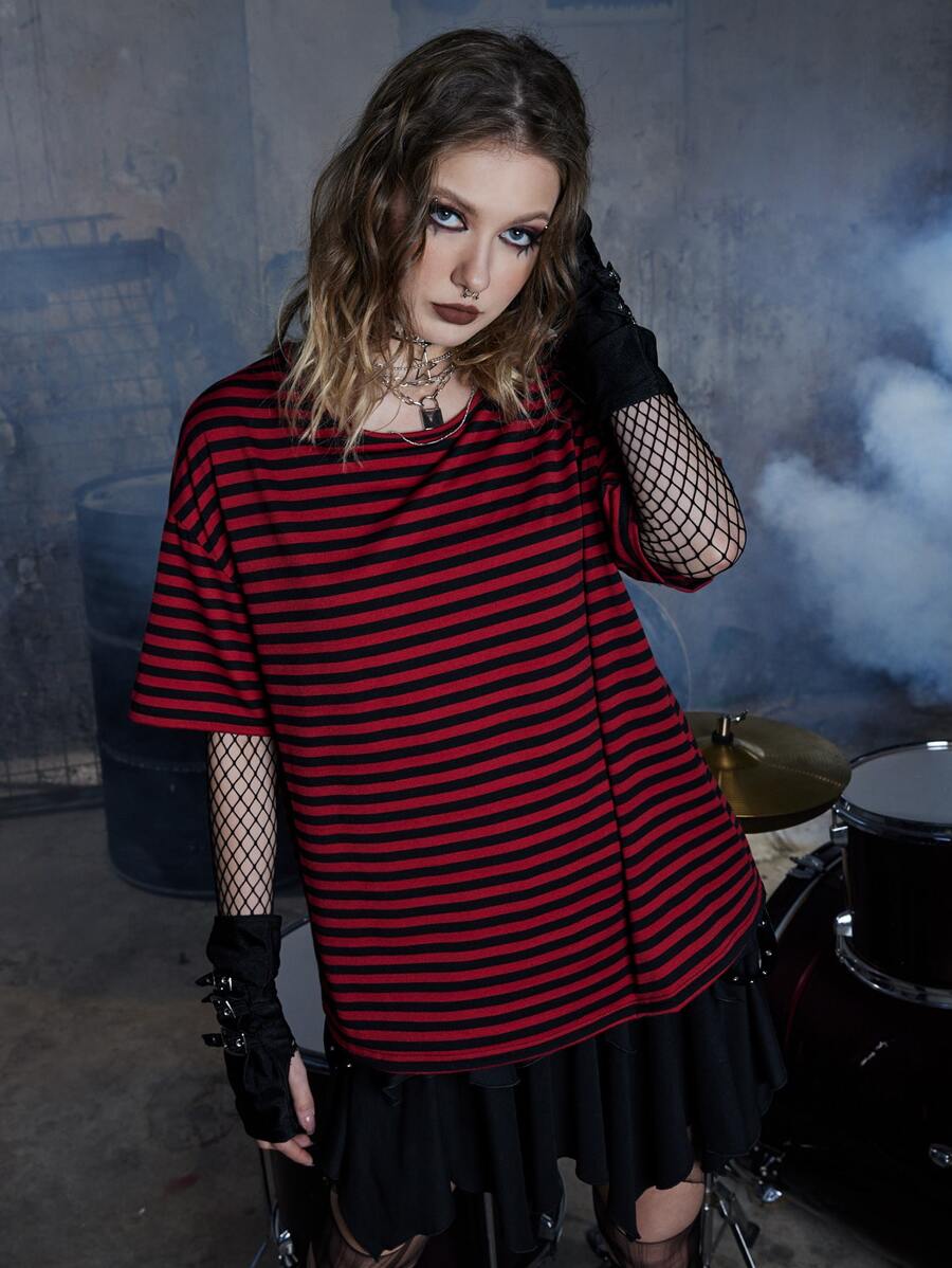 Grunge Punk T-shirt a righe con spalle a goccia, per la scuola