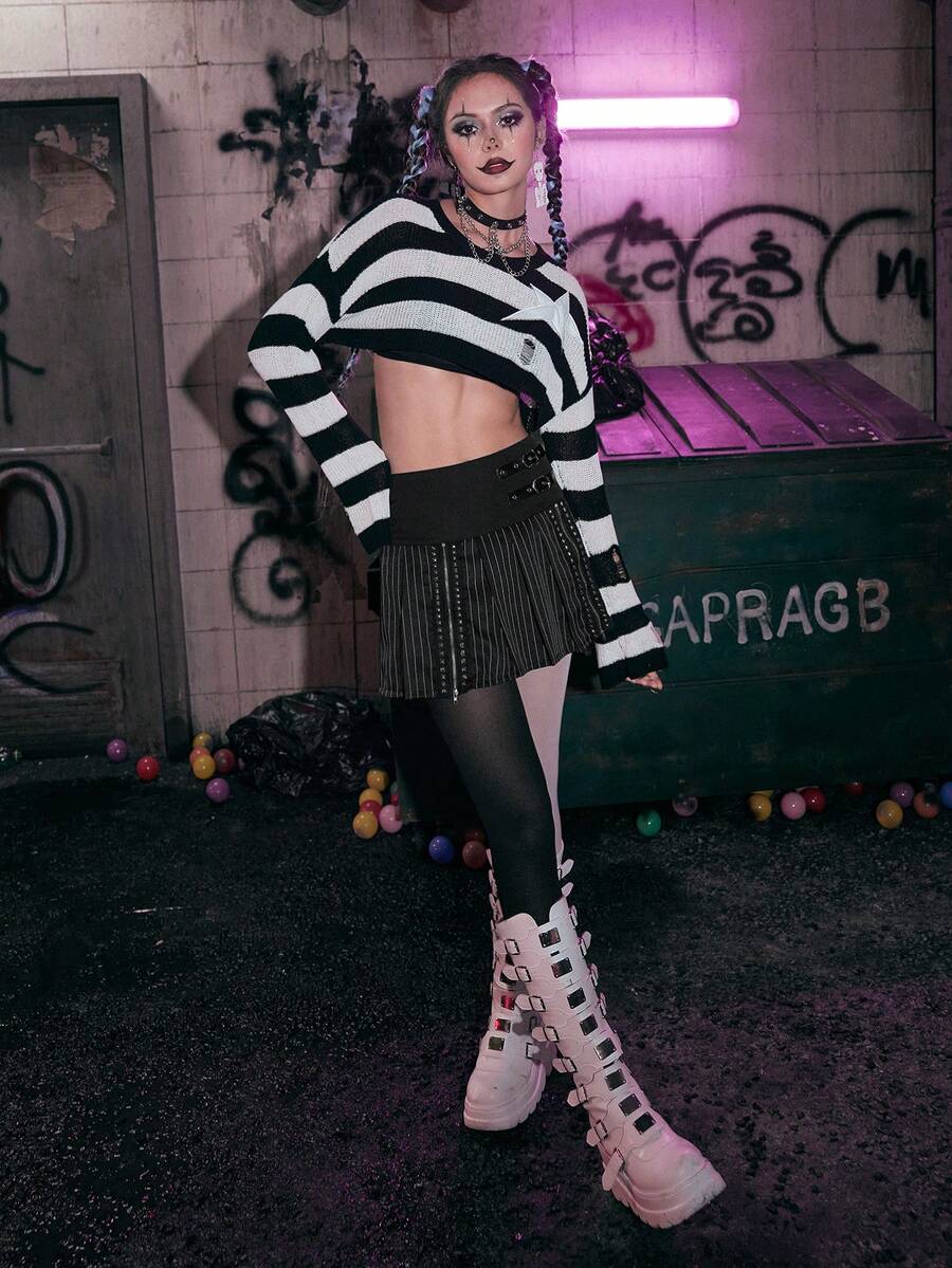 Grunge Punk Maglione corto righe con modello stelle spalle cadenti