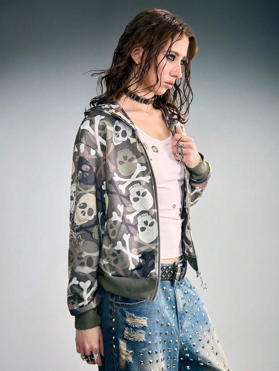 Grunge Punk Felpa con cappuccio e chiusura lampo, con colletto in pelliccia, stampa mimetica con teschio, decorazioni in strass, stile punk subcultura