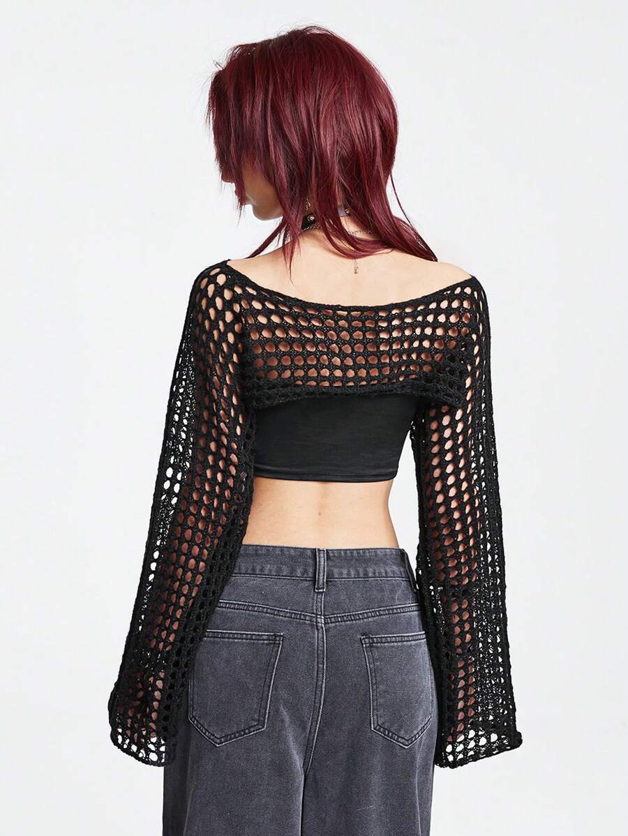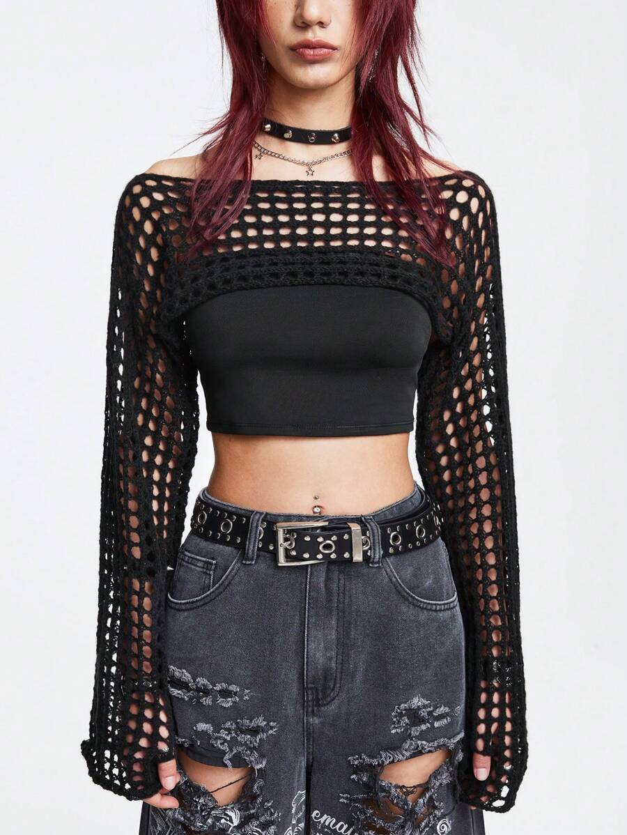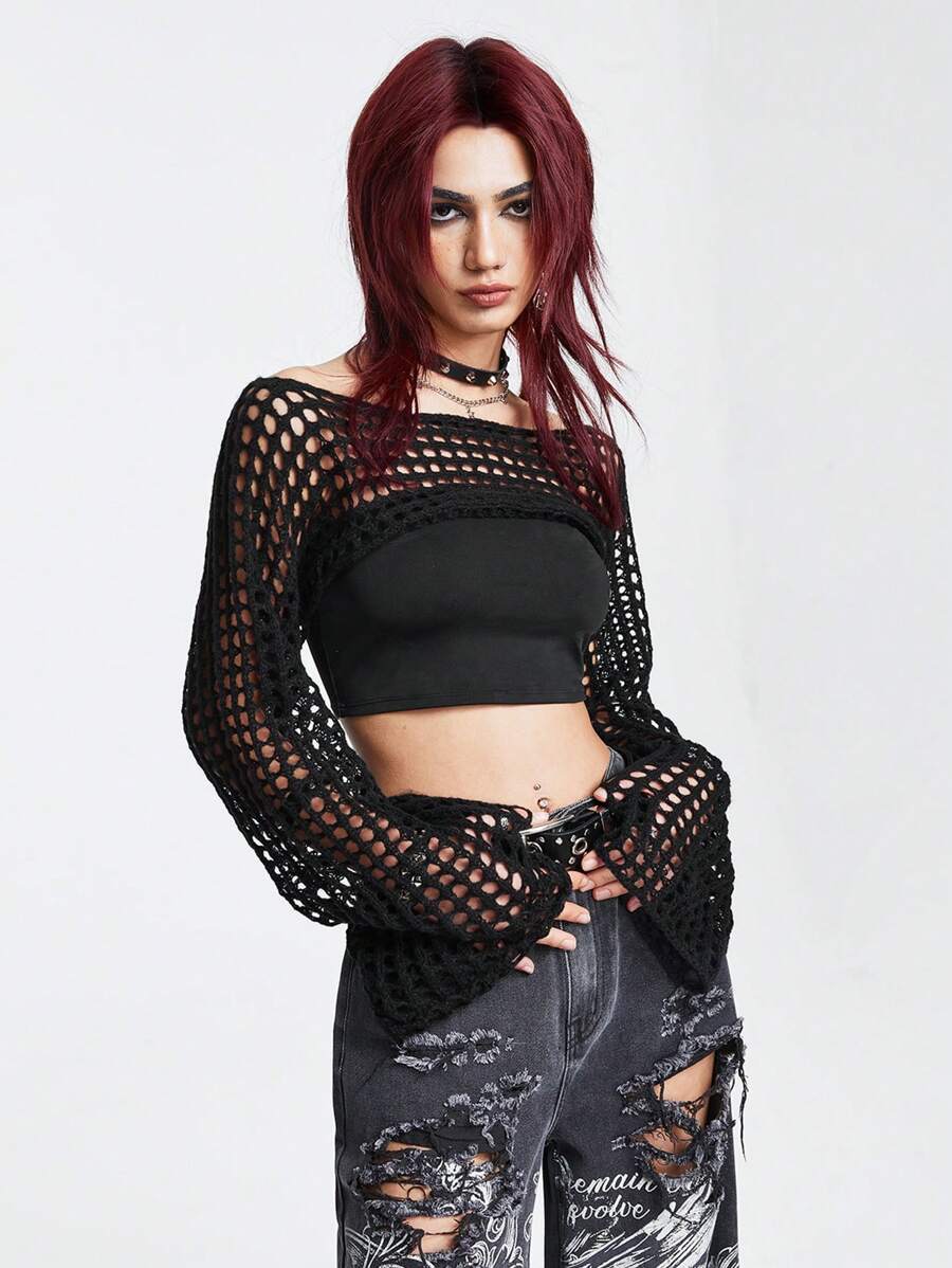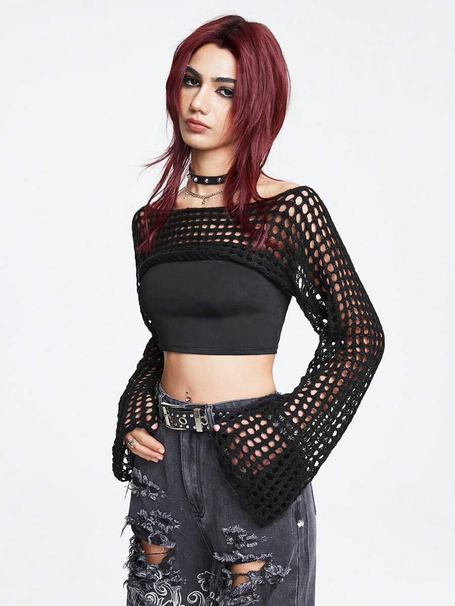 Grunge Punk Maglione corto estivo con maniche a trombetta, lavorato a uncinetto e a traforo, adatto per la scuola, manica lunga