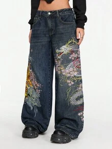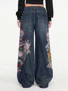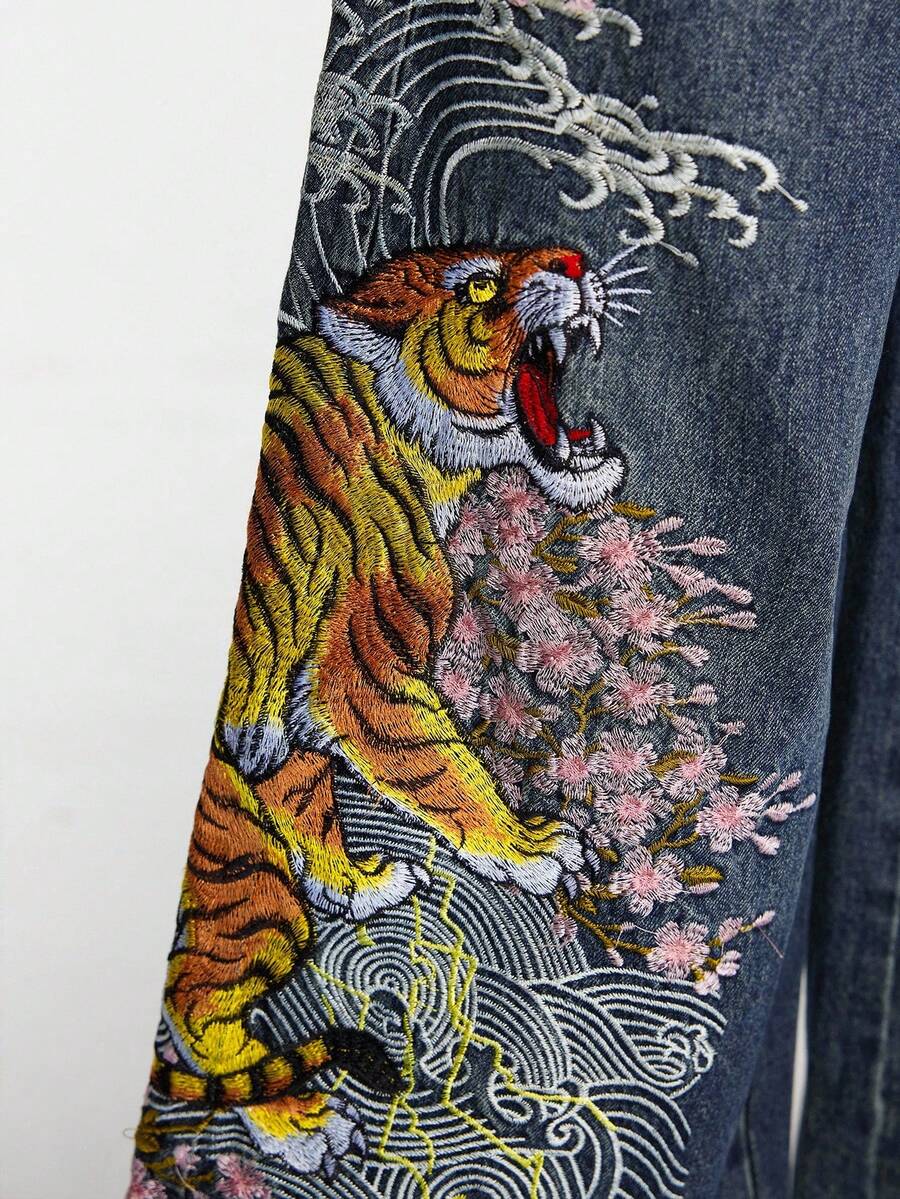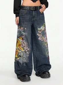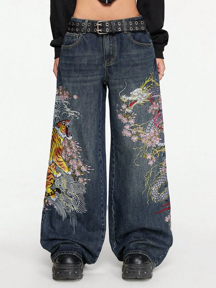 Grunge Punk Jeans ampi e larghi in stile retrò e da strada, con ricamo cinese di tigre e fiori, unisex