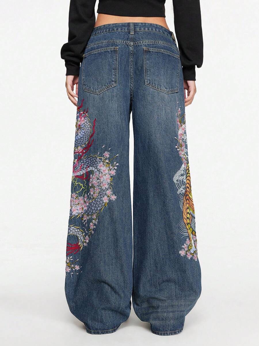 Grunge Punk Jeans ampi e larghi in stile retrò e da strada, con ricamo cinese di tigre e fiori, unisex