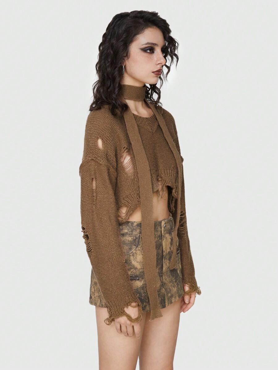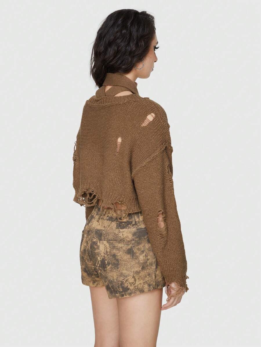 Grunge Punk Maglione Effetto Consumato Con Spalle Scoperte Da Donna
