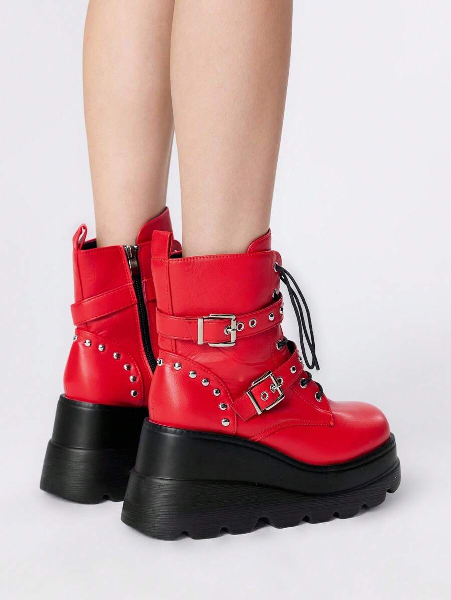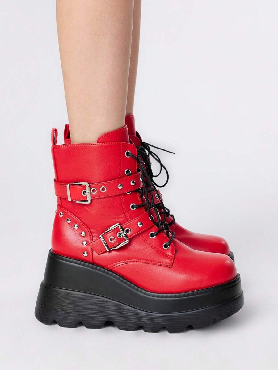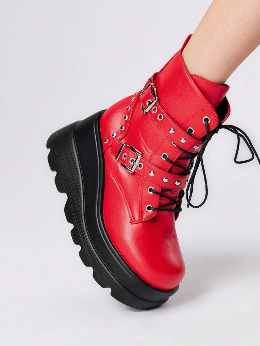Grunge Punk Stivaletti da donna alla caviglia, con punta tonda, allacciatura, suola spessa, stile punk, colore nero, nuova collezione autunno/inverno 2024