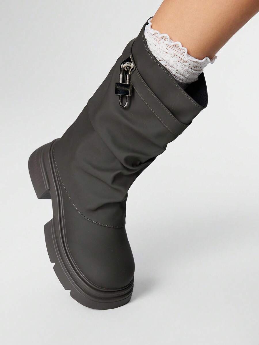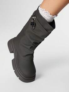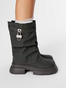 Grunge Punk Stivali da motociclista da donna neri con fibbia, stivali alti in pelle con tacco basso, stivali con punta tonda e polpaccio a metà gamba, casual da strada stile punk campus