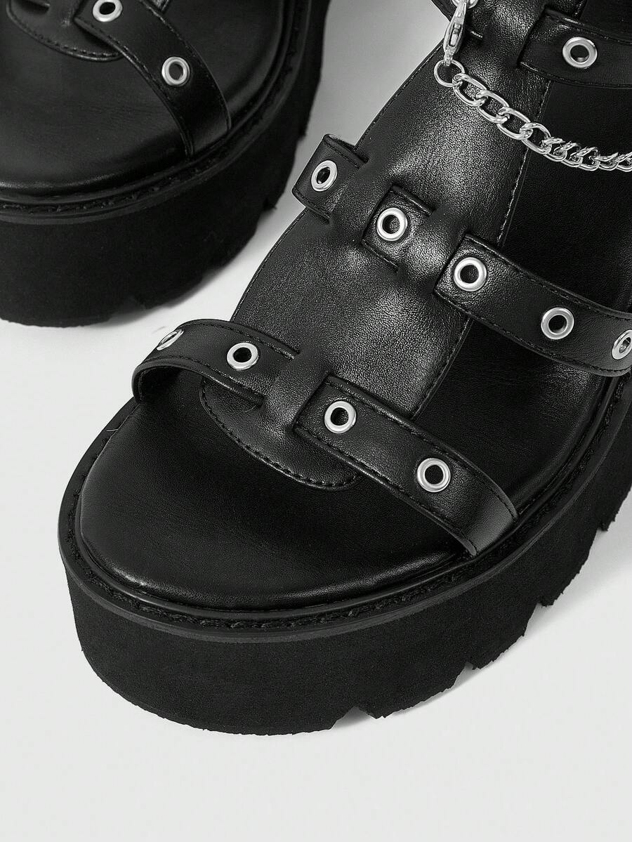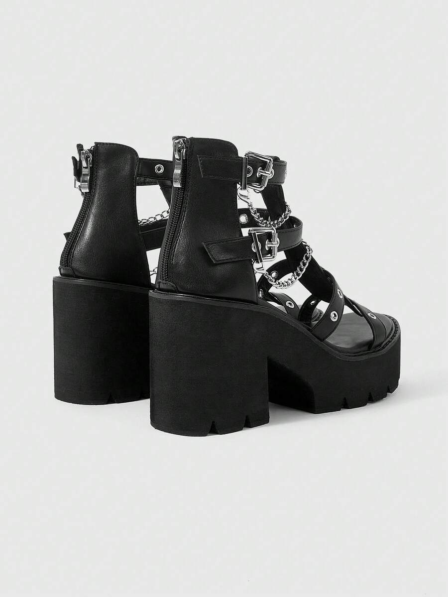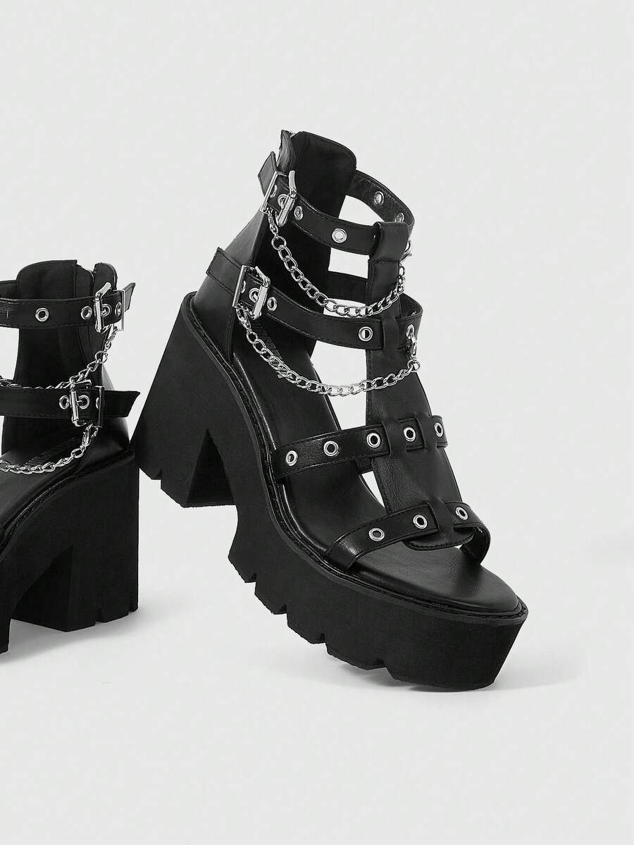 Grunge Punk Sandali con plateau da donna neri, tacco chunky spesso, punta aperta, cinturino alla caviglia con cerniera posteriore, scarpe romane, suola in gomma resistente, scarpe casual per tutte le stagioni