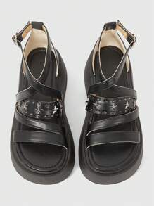 Grunge Punk Sandali neri da donna in stile punk con suola spessa, punta tonda, in pelle PU, design a più fasce, decorazione a stella a cinque punte, con plateau da 6 cm, adatto per feste e raduni