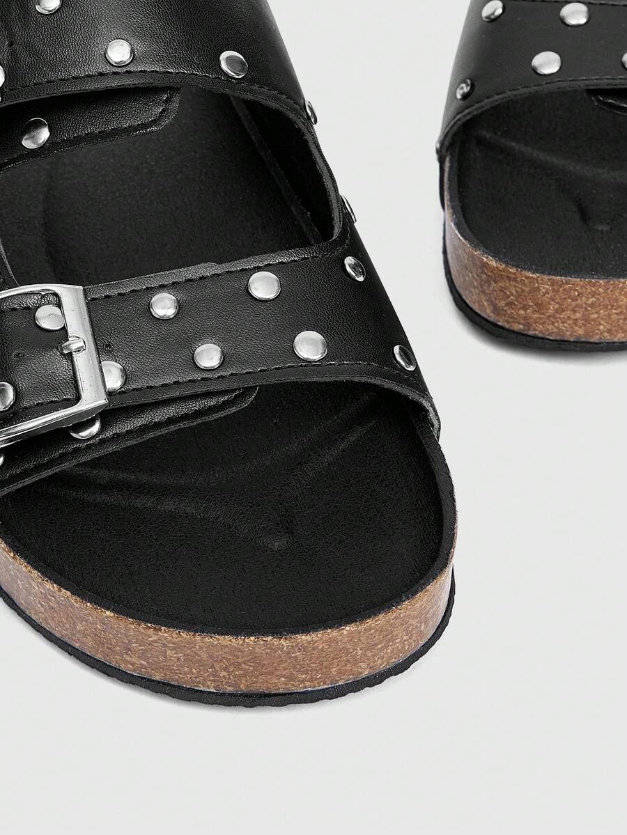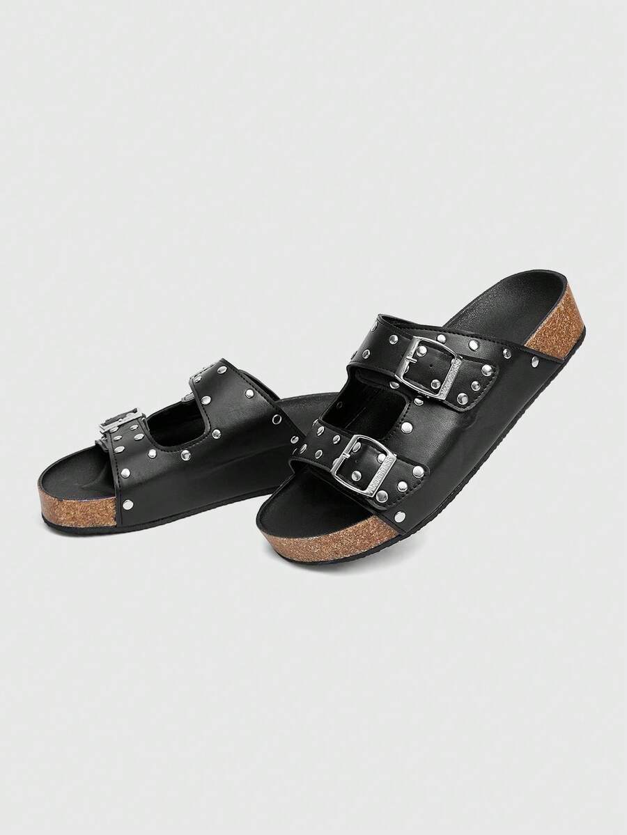 Grunge Punk Sandali da donna neri di stile romano per la spiaggia, sandali piatti estivi da vacanza con cinturino a fibbia e punta aperta