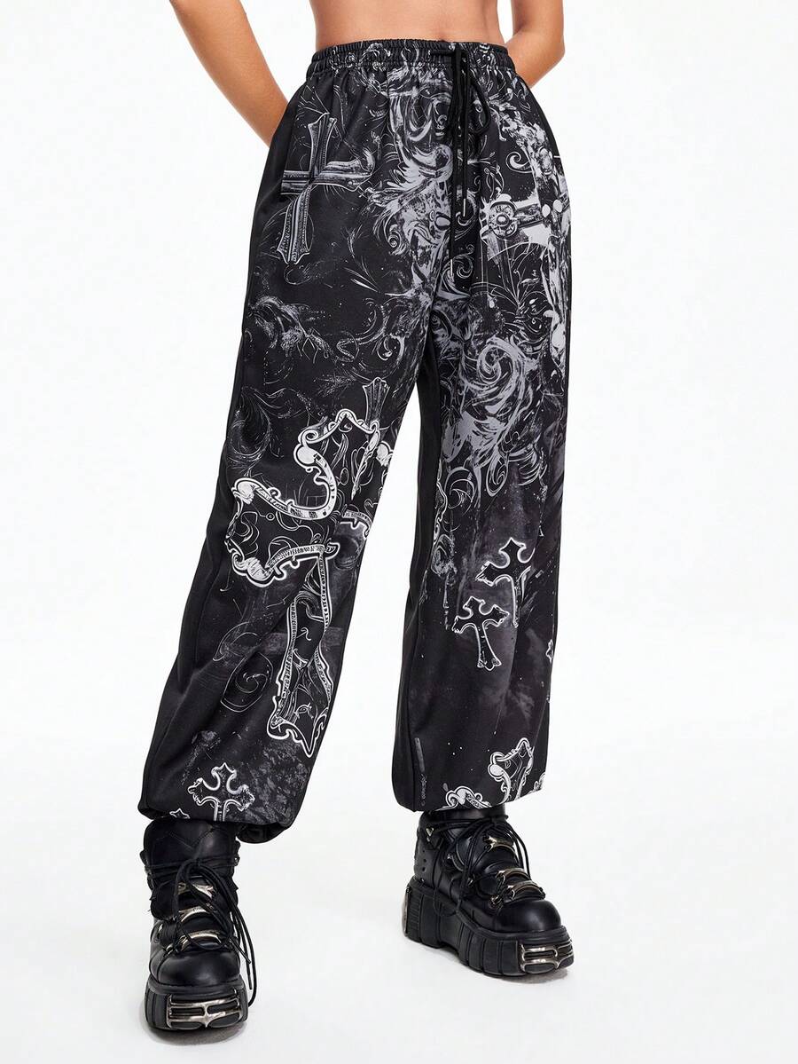 Grunge Punk Pantaloni della tuta da donna con stampa digitale a croce, teschio e elementi floreali