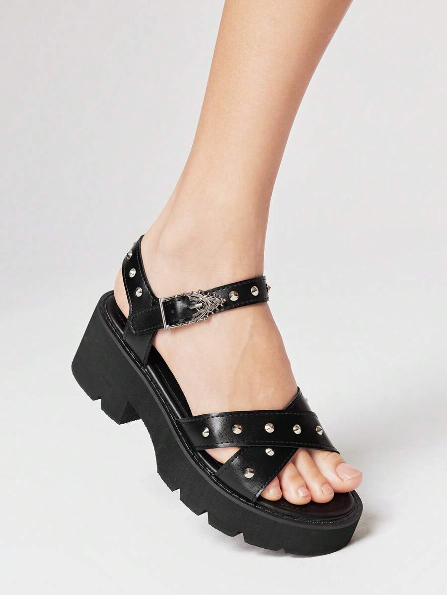Grunge Punk Sandali da donna con plateau e borchie - Stile casual punk estivo con tacco a blocco, punta aperta, comodi e traspiranti, slip-on