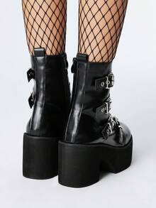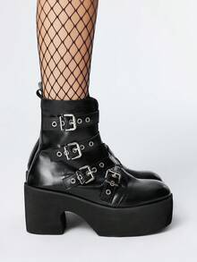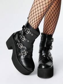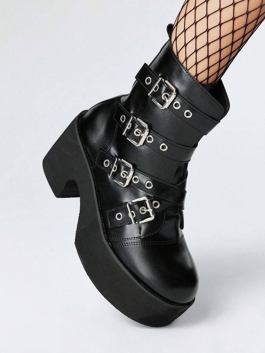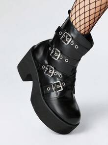 Grunge Punk Stivali da donna stile gotico con fibbie in metallo e punta tonda, tacco chunky, stivali punk in PU nero con tacco alto, adatti per feste, uso quotidiano, abiti da sera, per aumentare l'altezza e allungare le gambe