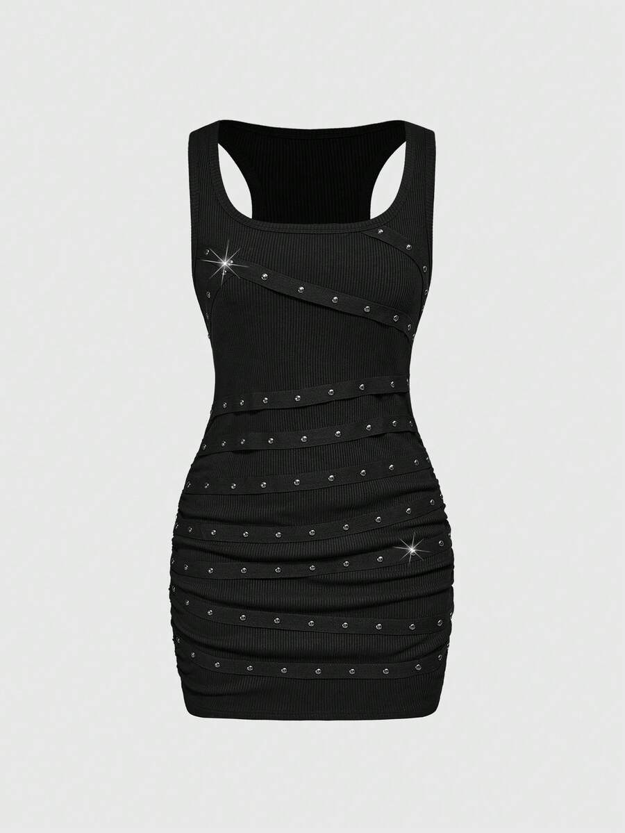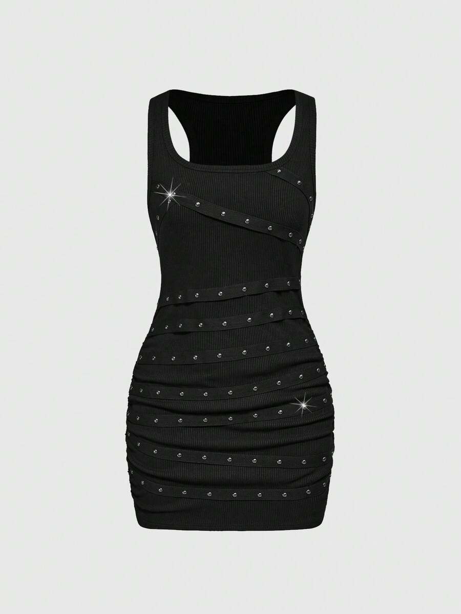 Grunge Punk Abito mini nero sexy e senza maniche da donna con borchie, strass e design a bretelle, adatto per spiaggia estiva, laurea, Pasqua, concerti, vacanze a Nashville, festival musicali