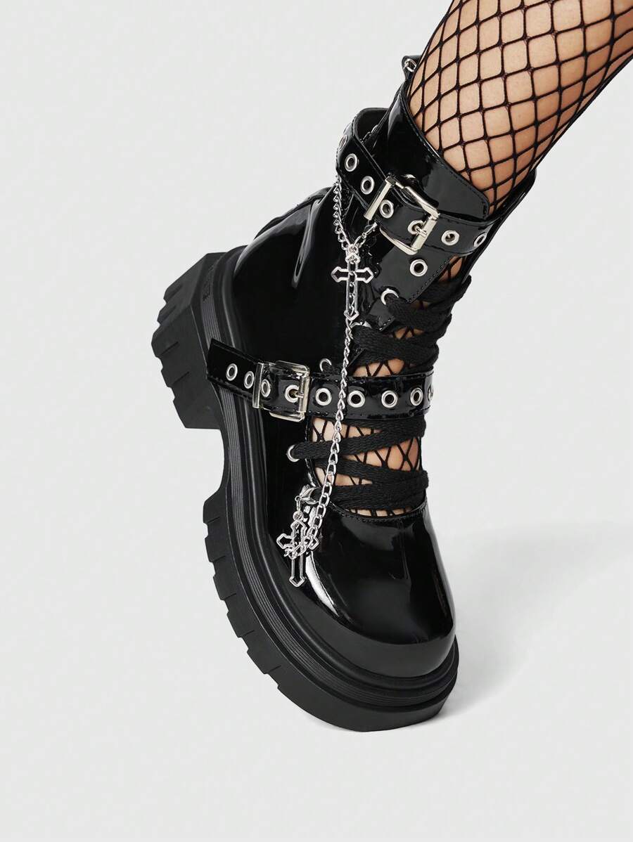 Grunge Punk Stivali alla caviglia da donna in vernice lucida, con catena a croce, punta tonda, suola piatta, in stile punk dark, in PU nero, adatti per l'' uso quotidiano, per rockstar, punk, e campus