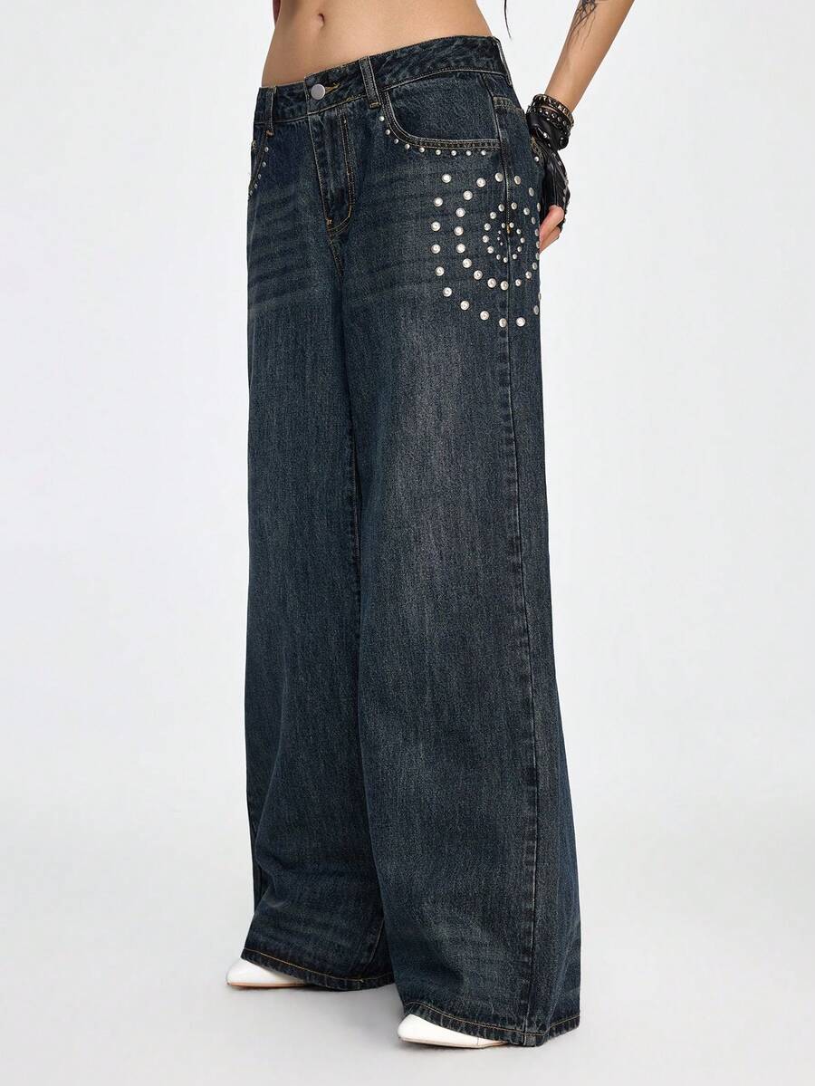 Grunge Punk Jeans a gamba larga da donna con tasche, bottoni, rivetti e lavaggio vintage consumato, adatti per l'uso quotidiano