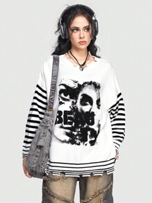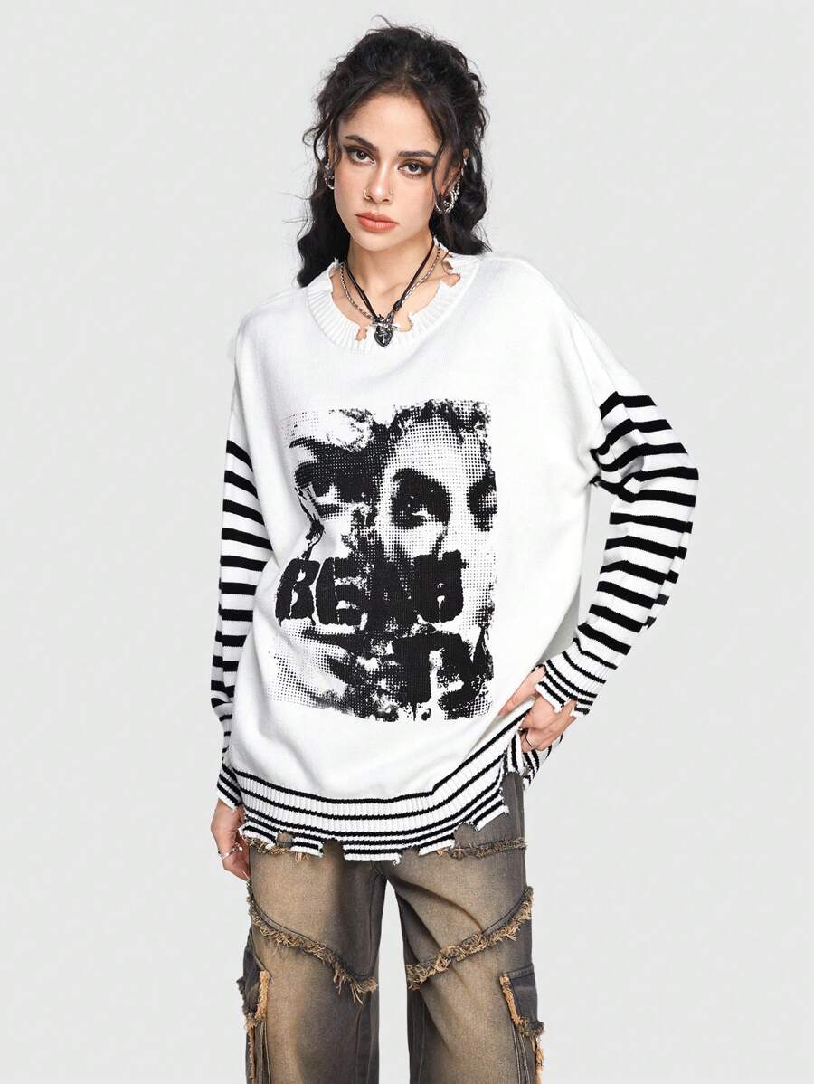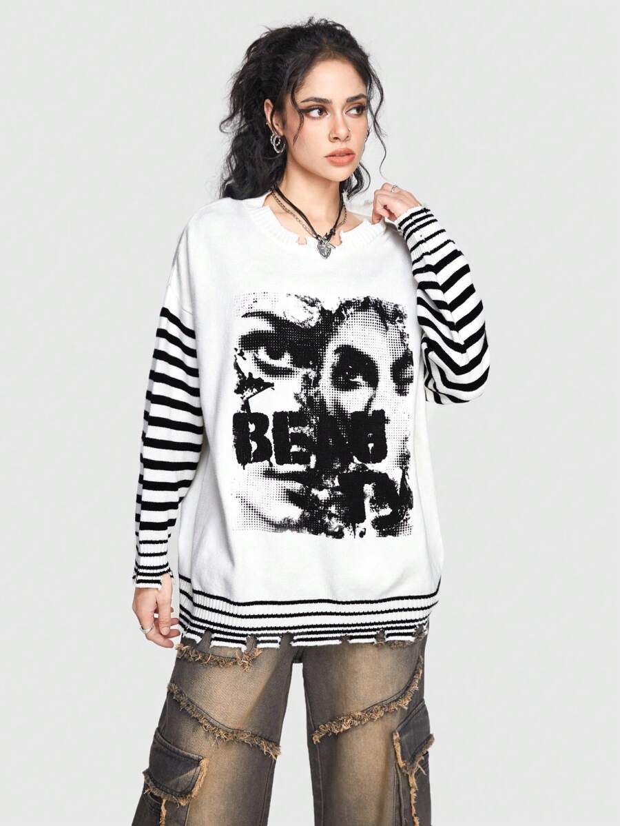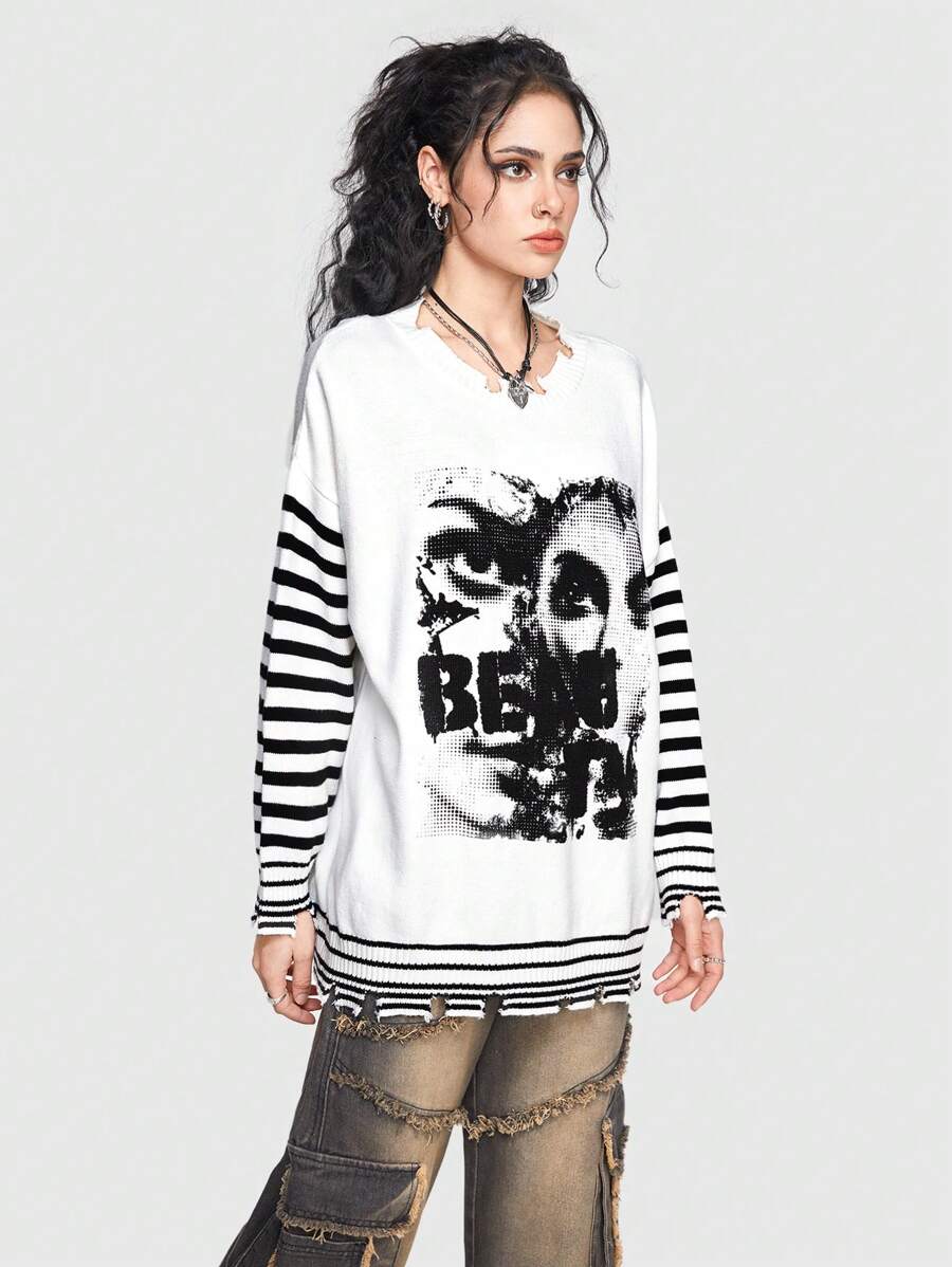 Grunge Punk Maglione Con Collo A Scialle Da Donna Con Silhouette Di Ritratto Stampato E Patchwork A Righe