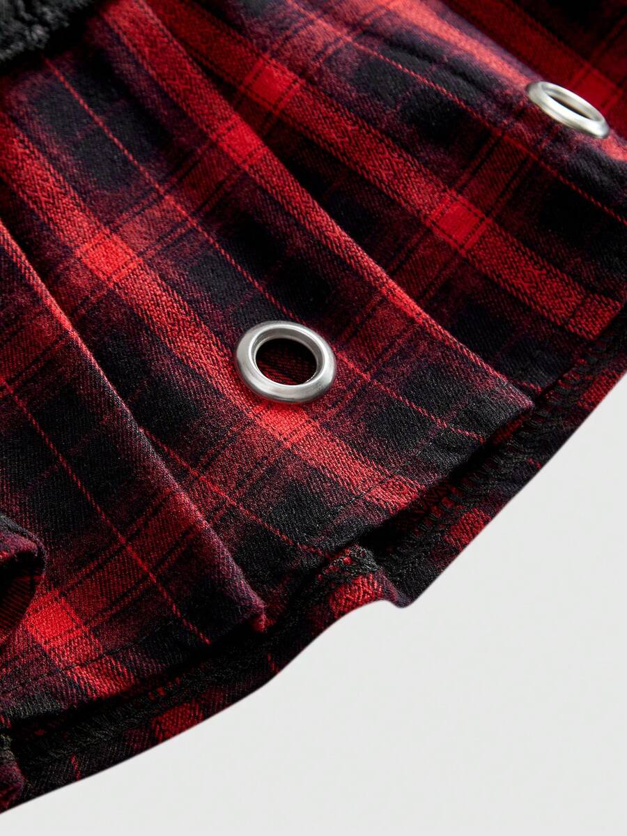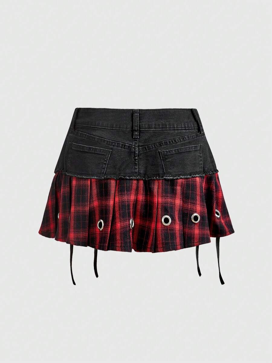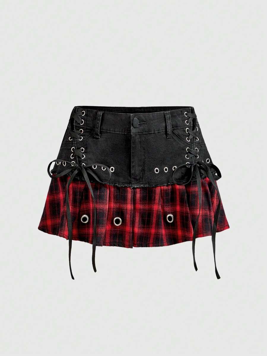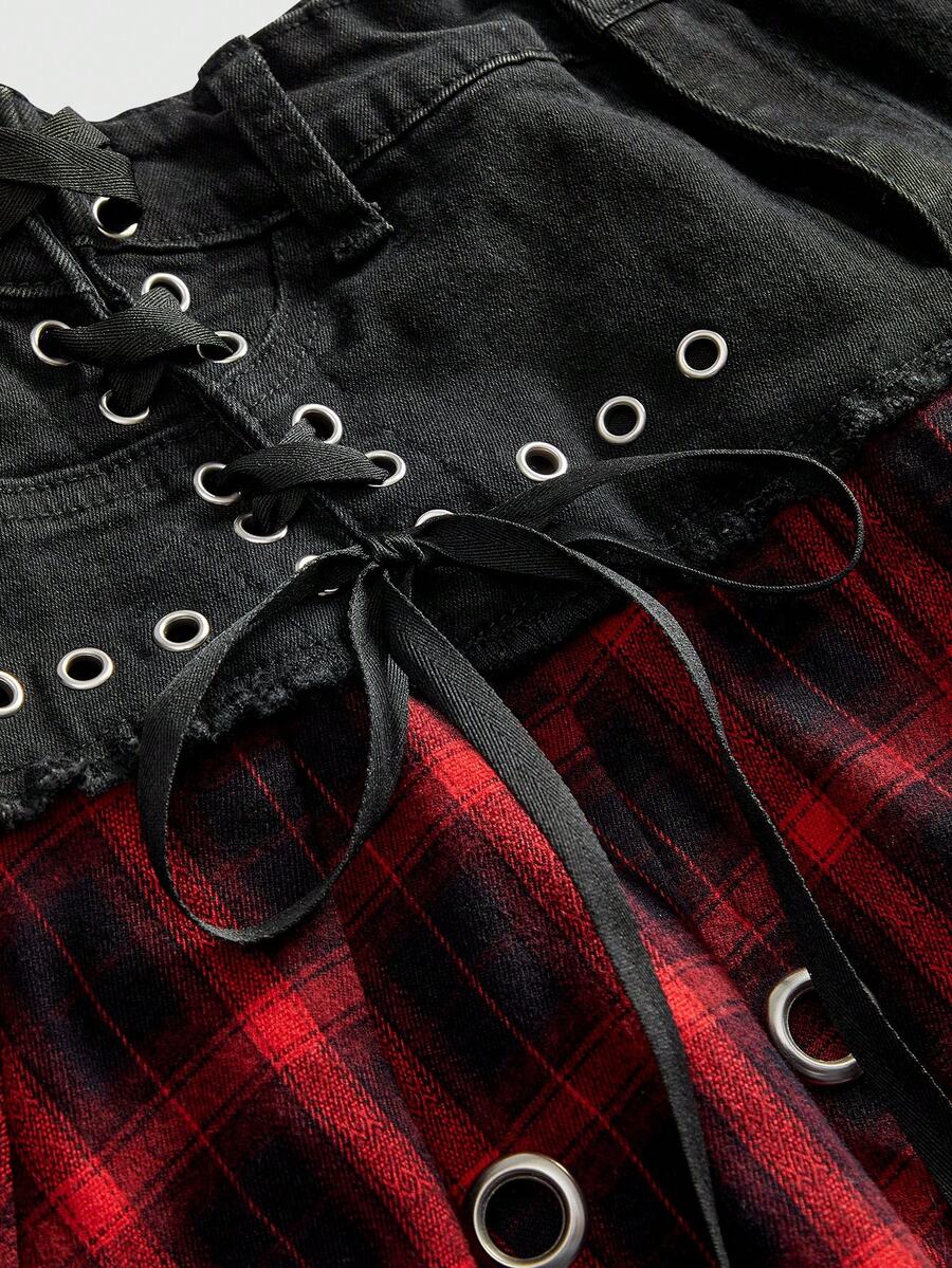 Grunge Punk Gonna di jeans mini aderente in vita bassa, con patchwork a quadri retrò e lacci metallici, stile casual per le donne