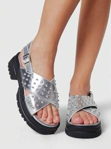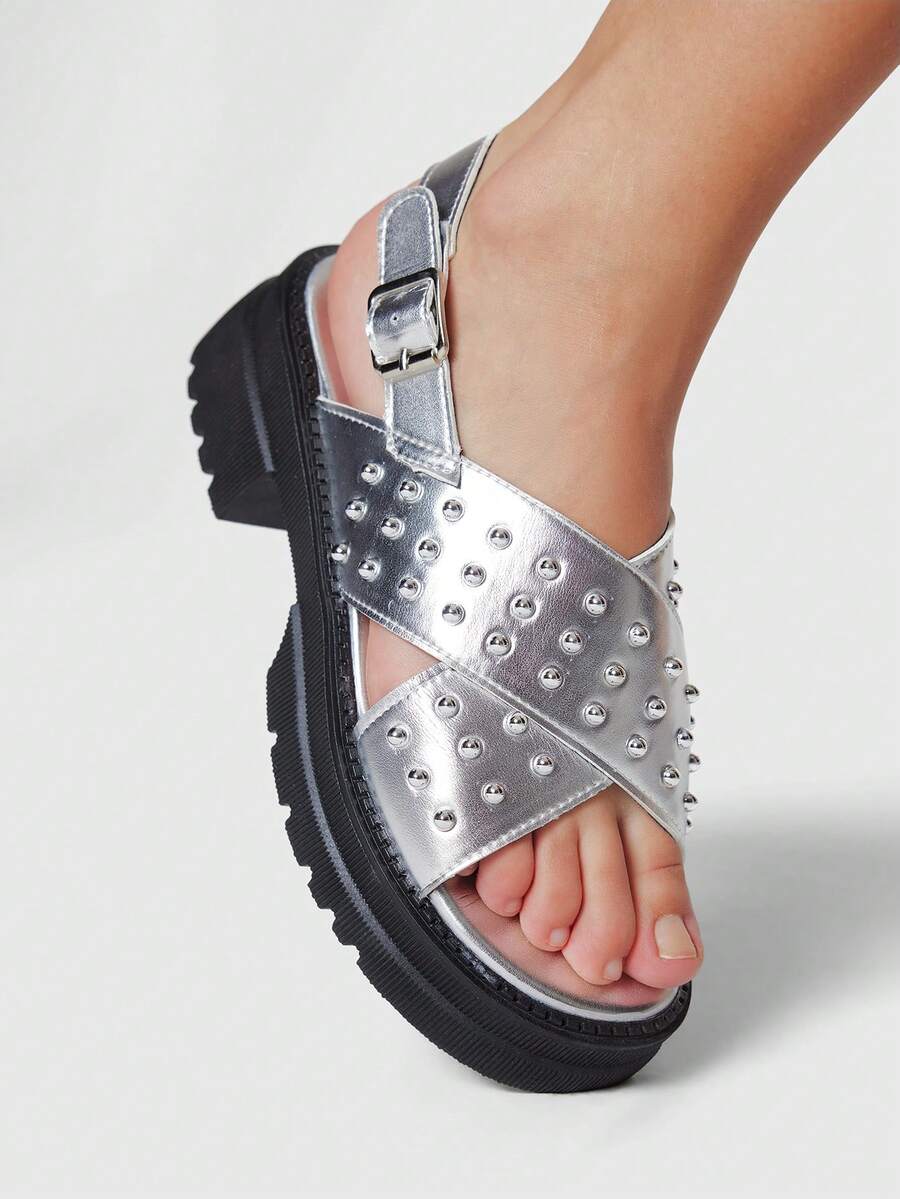 Grunge Punk Sandali da donna con fasce incrociate in argento, scarpe da spiaggia e vacanza estiva con zeppa platform punk e borchie