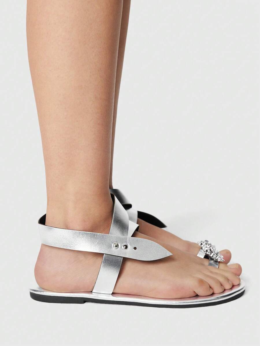 Grunge Punk Sandali estivi da donna con cinturini incrociati, suola morbida con glitter argento e strass, infradito flat con cinturini, adatti per la spiaggia e le vacanze