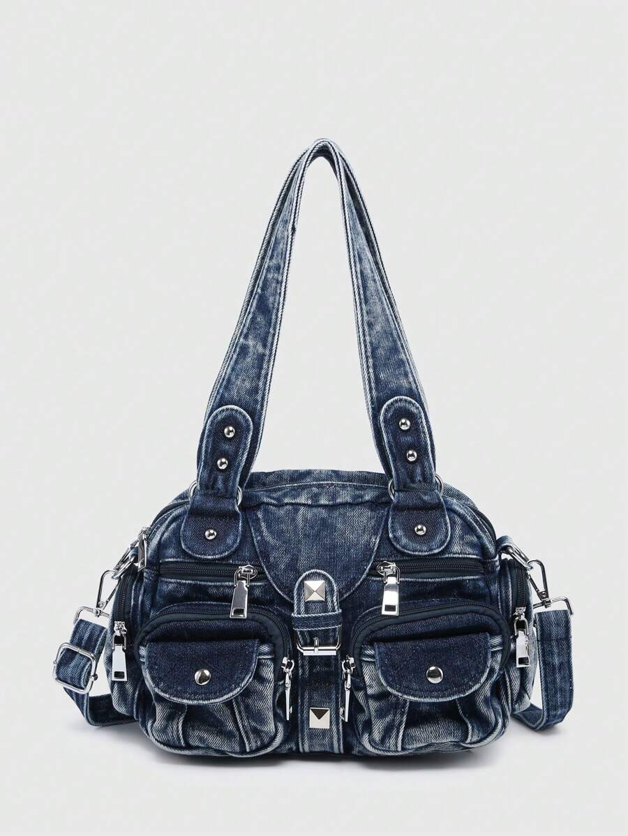 Grunge Punk Borsa a spalla vintage da donna con decorazione a croce e cuore sfumata e fiocco, grande capacità, multitasche