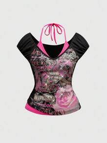 Grunge Punk Maglietta estiva da donna con fiori di rosa vintage, motivo floreale, cuore con strass, laccio al collo a contrasto e fiocco