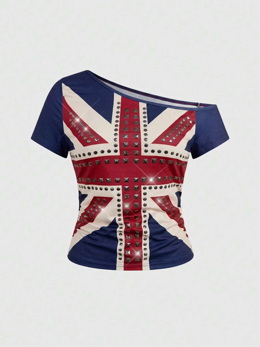 Grunge Punk Maglietta aderente a maniche corte con stampa retrò della bandiera britannica, strass e borchie, stile Y2K per donna