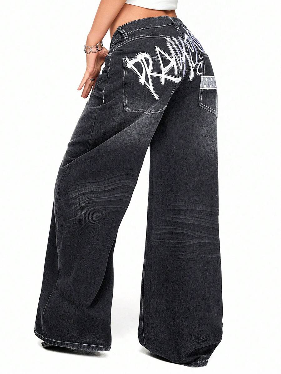 Grunge Punk Jeans larghi a vita bassa con effetto vissuto, con ricamo di lettere e croci, stile Y2K chic, vestibilità ampia per le donne
