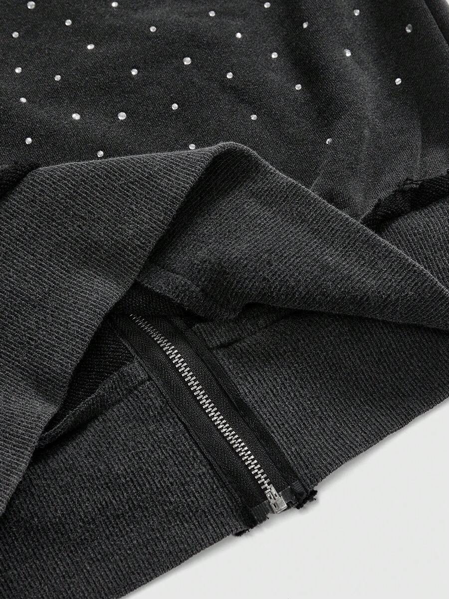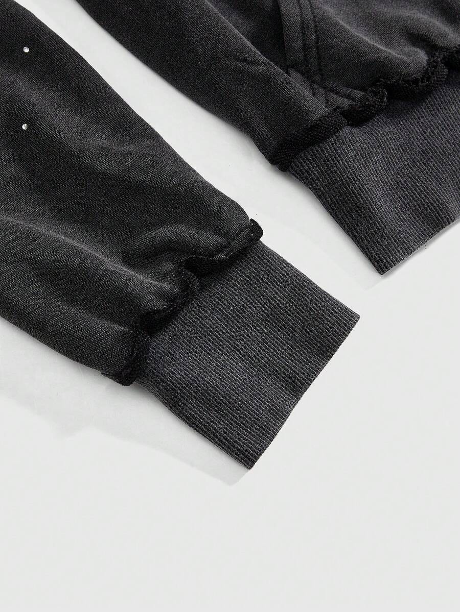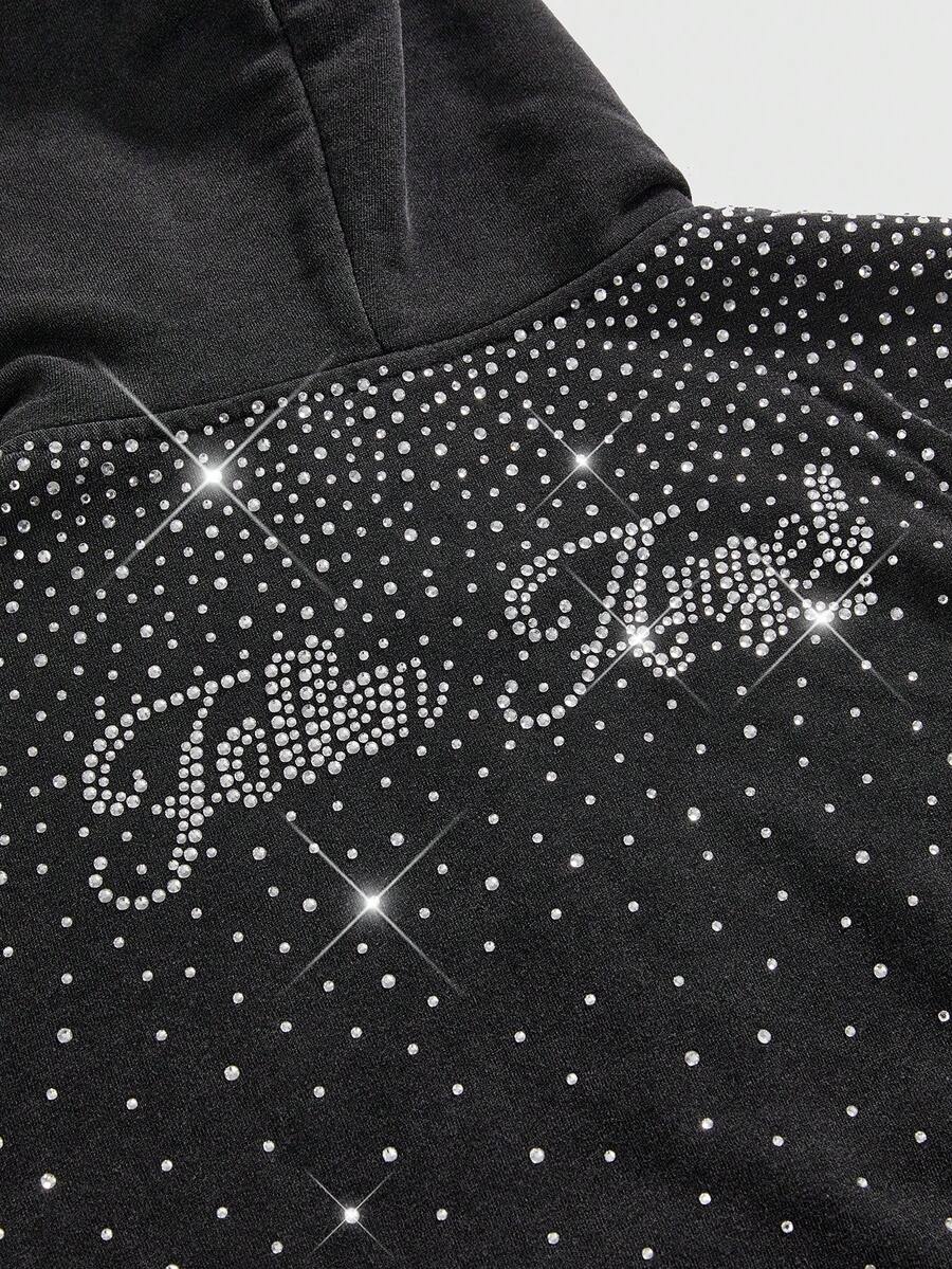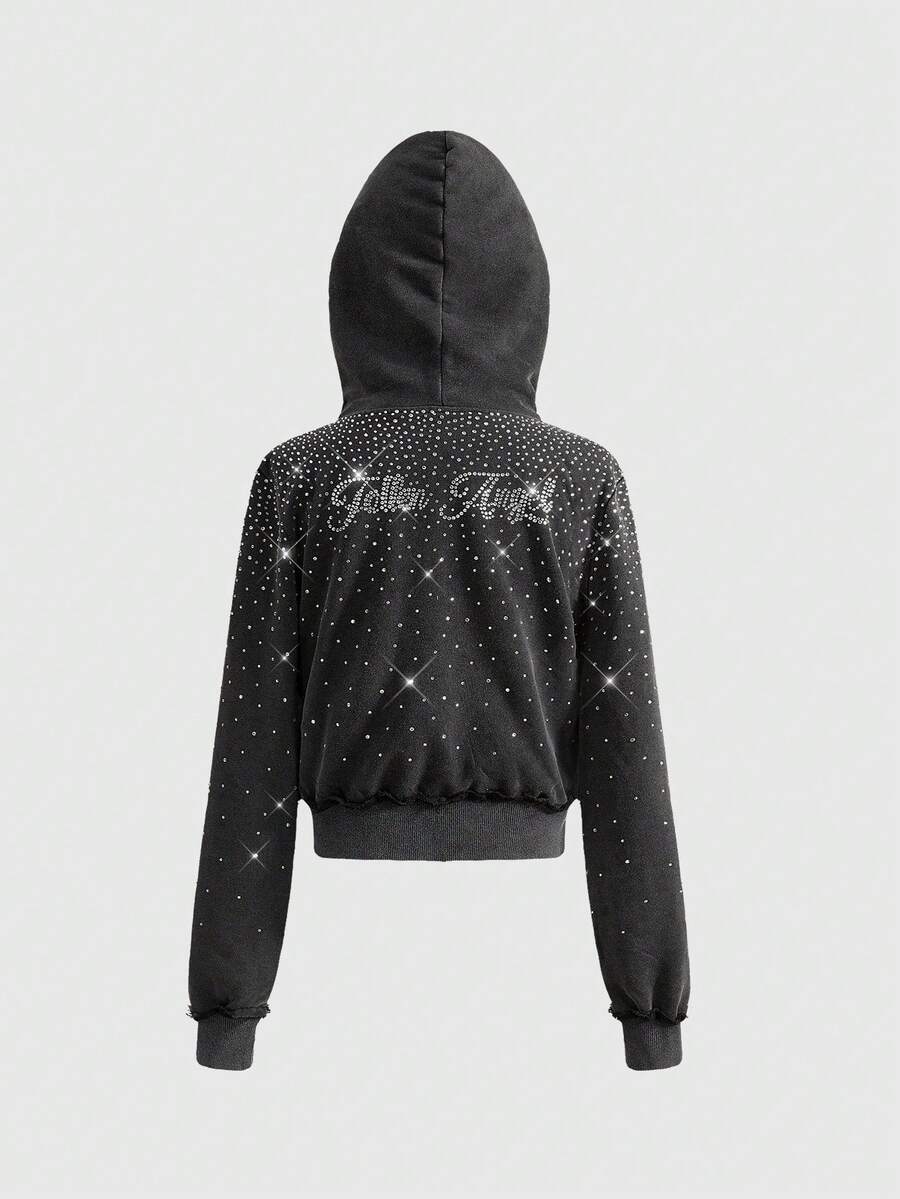 Grunge Punk Felpa corta con cappuccio Y2K Kpop, lavata e consumata, con strass