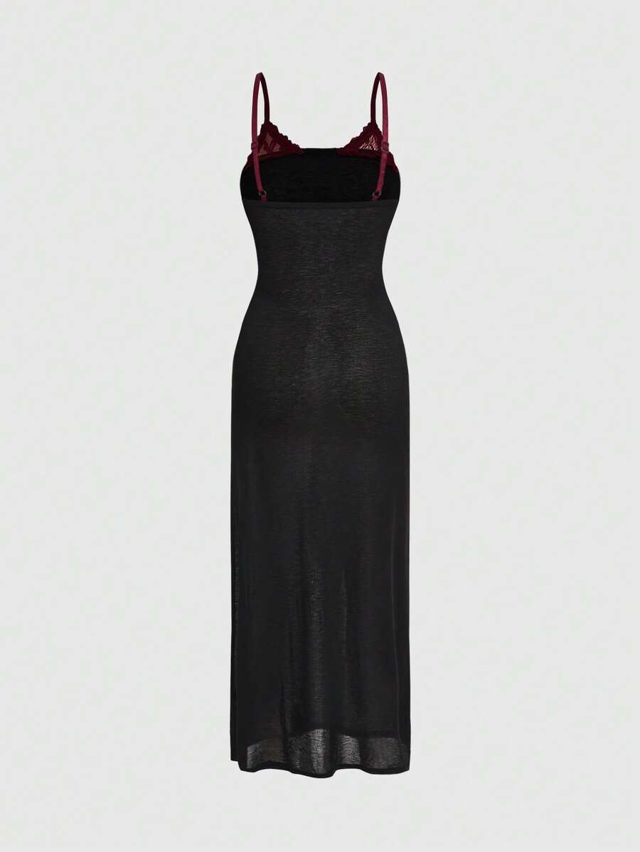 Grunge Punk Abito lungo da donna con spalline a spaghetti, stile Y2K, semi-trasparente, con contrasto di pizzo e stampa in inglese