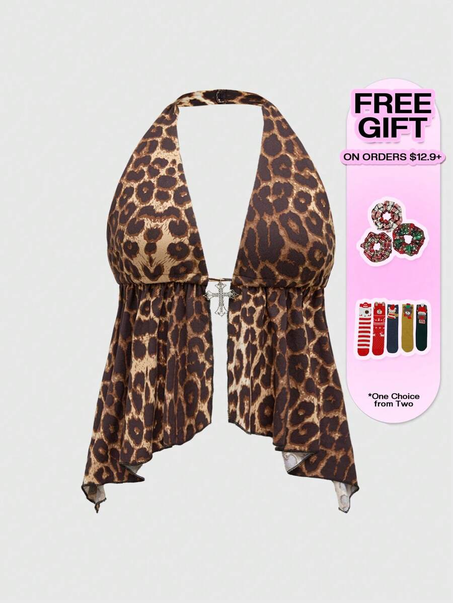 Grunge Punk Canotta corta con schiena scoperta con stampa leopardata all-over e pendente a croce in metallo in stile Y2K per festival musicali