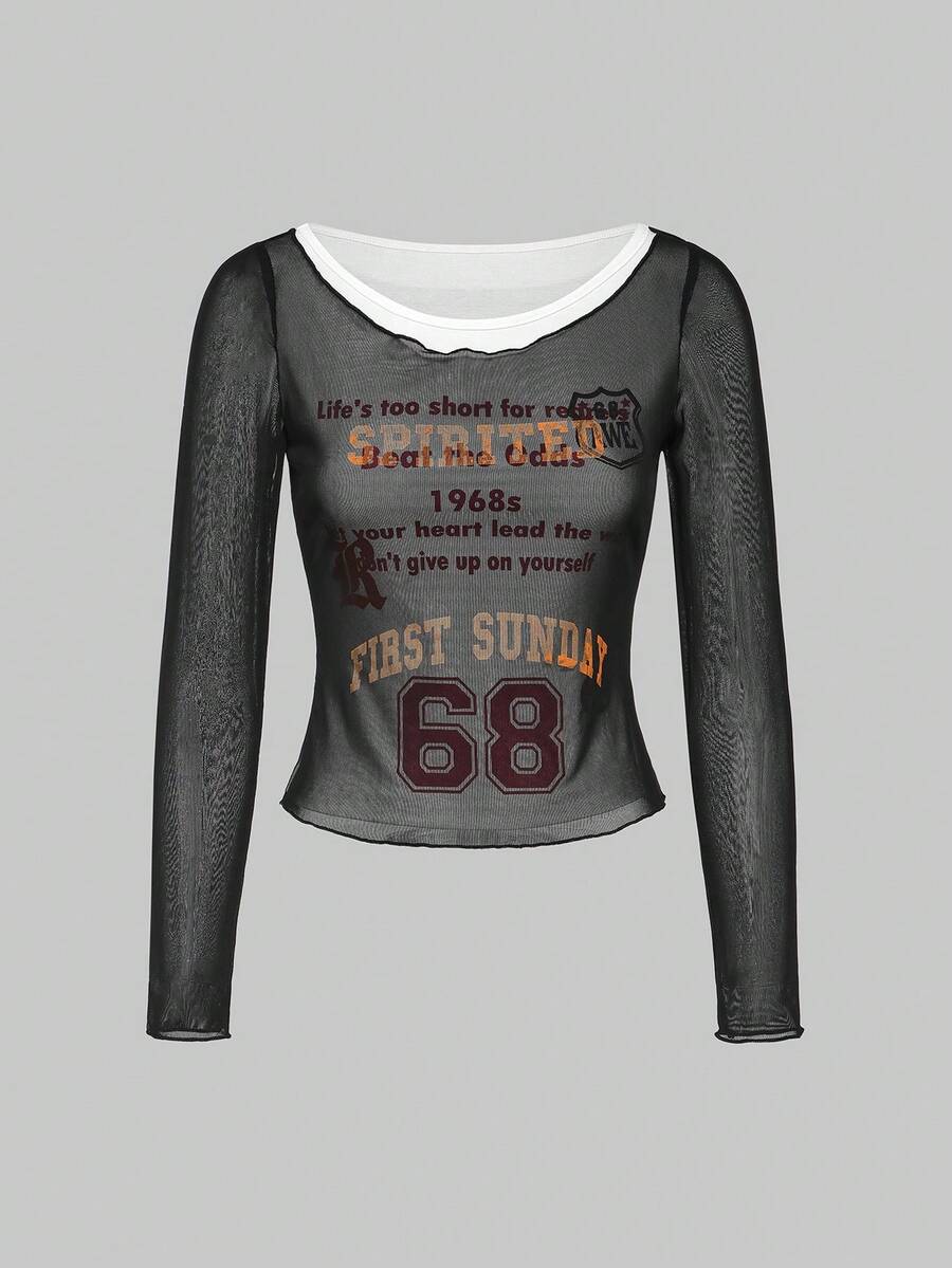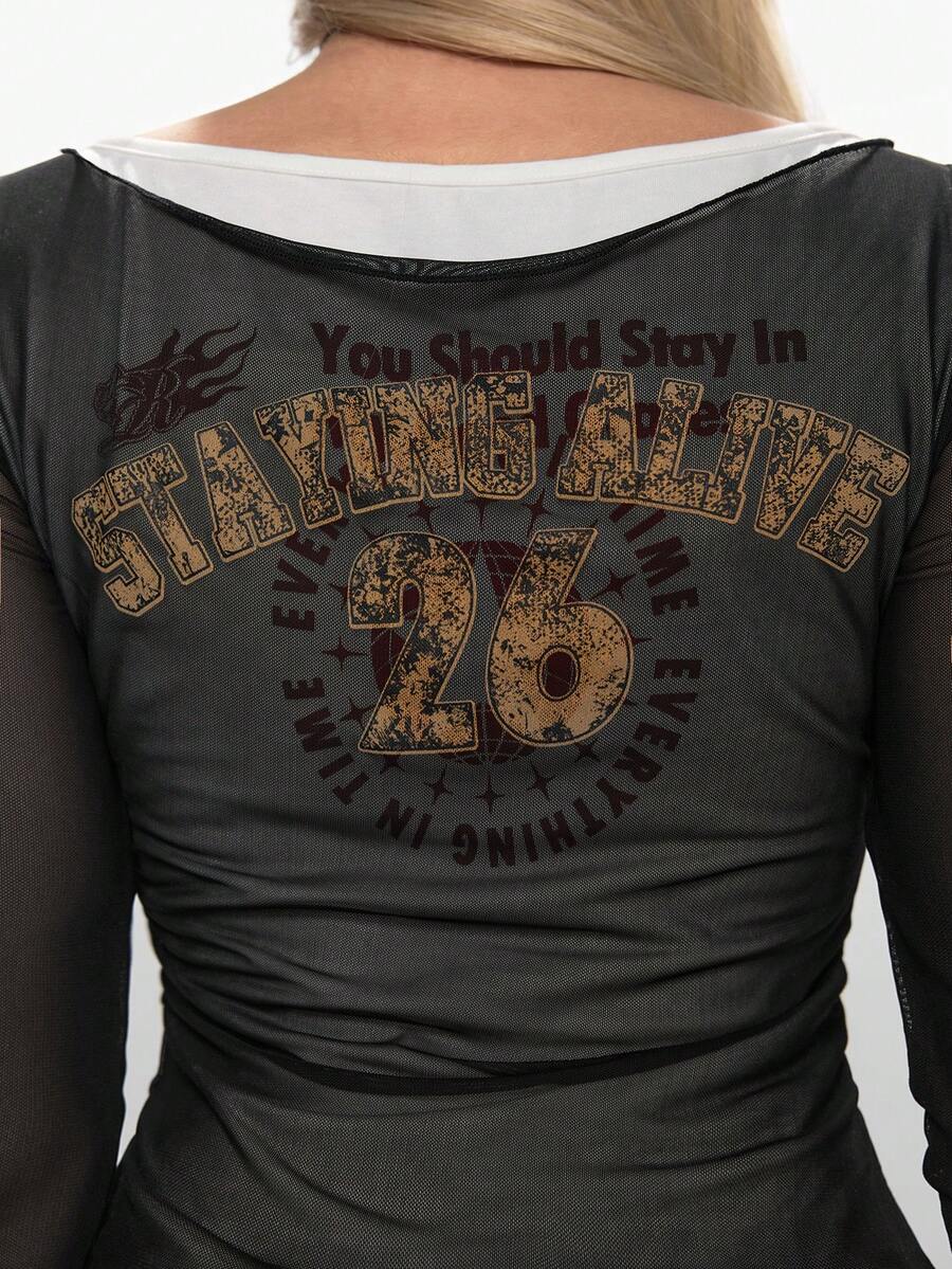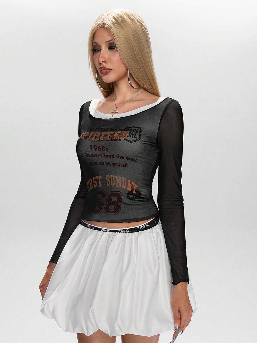 Grunge Punk Parte superiore donna Y2K sexy e trasparente in rete stampata, senza spalle