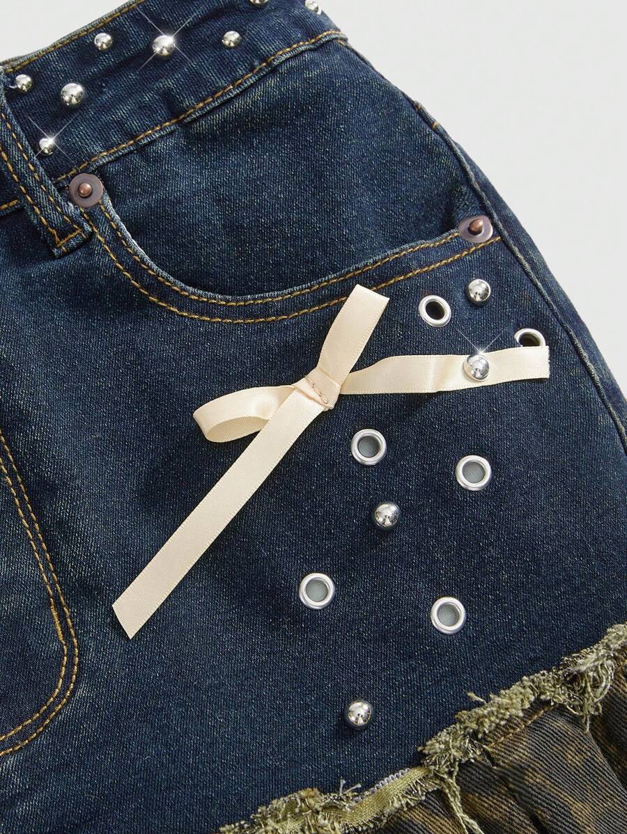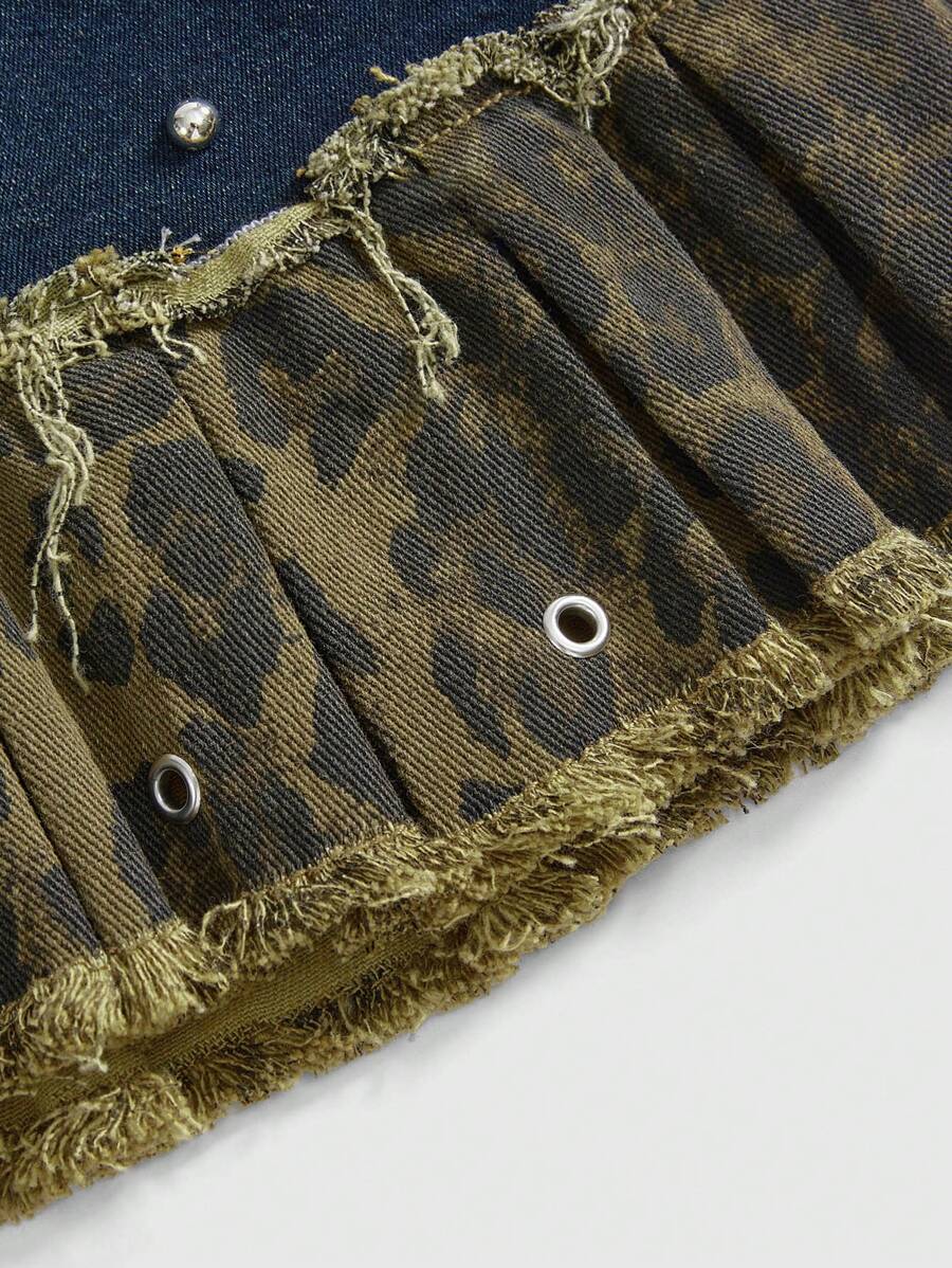 Grunge Punk Minigonna di jeans in stile Y2K, vita super bassa, con stampa leopardata, pieghe e fiocco decorativo