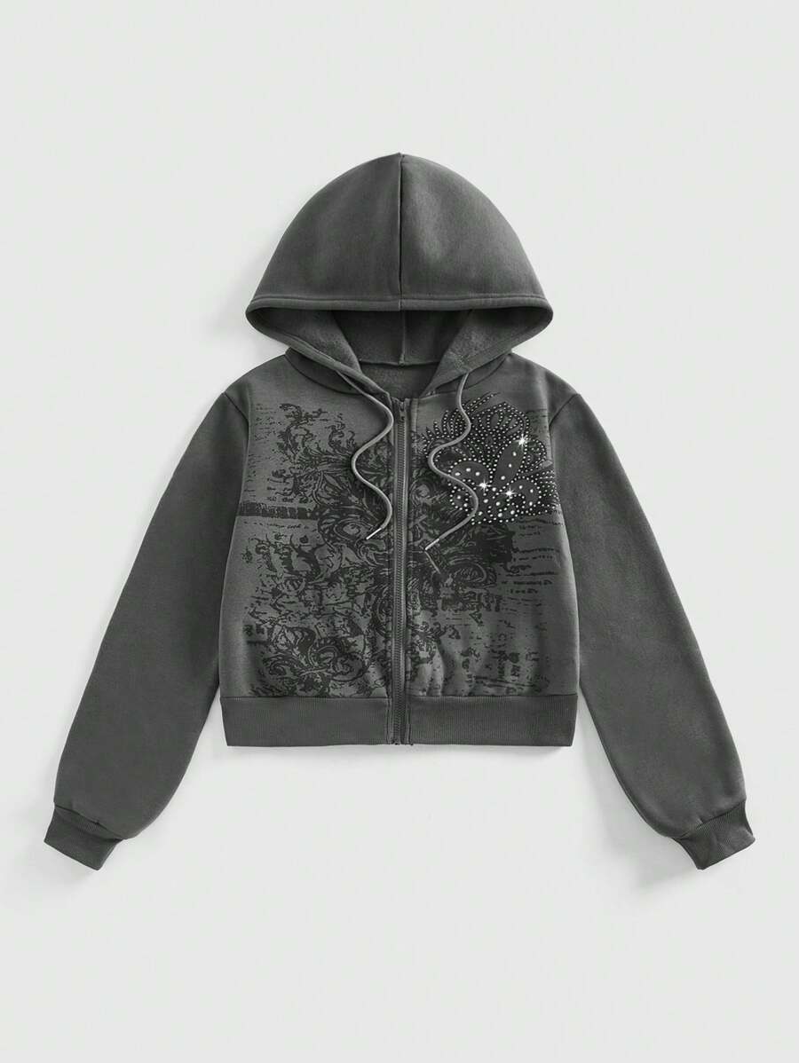 Grunge Punk Giacca con cappuccio da donna in stile sottoculttura Y2K, con stampa retrò a motivo di vite e decorazioni in strass