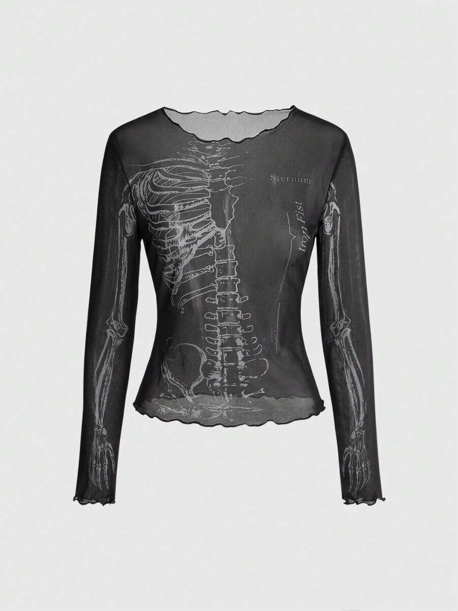 Grunge Punk Blusa nera in rete trasparente con stampa scheletro in stile retrò americano, stile sottocultura Y2K streetwear, scollo rotondo sexy per donne