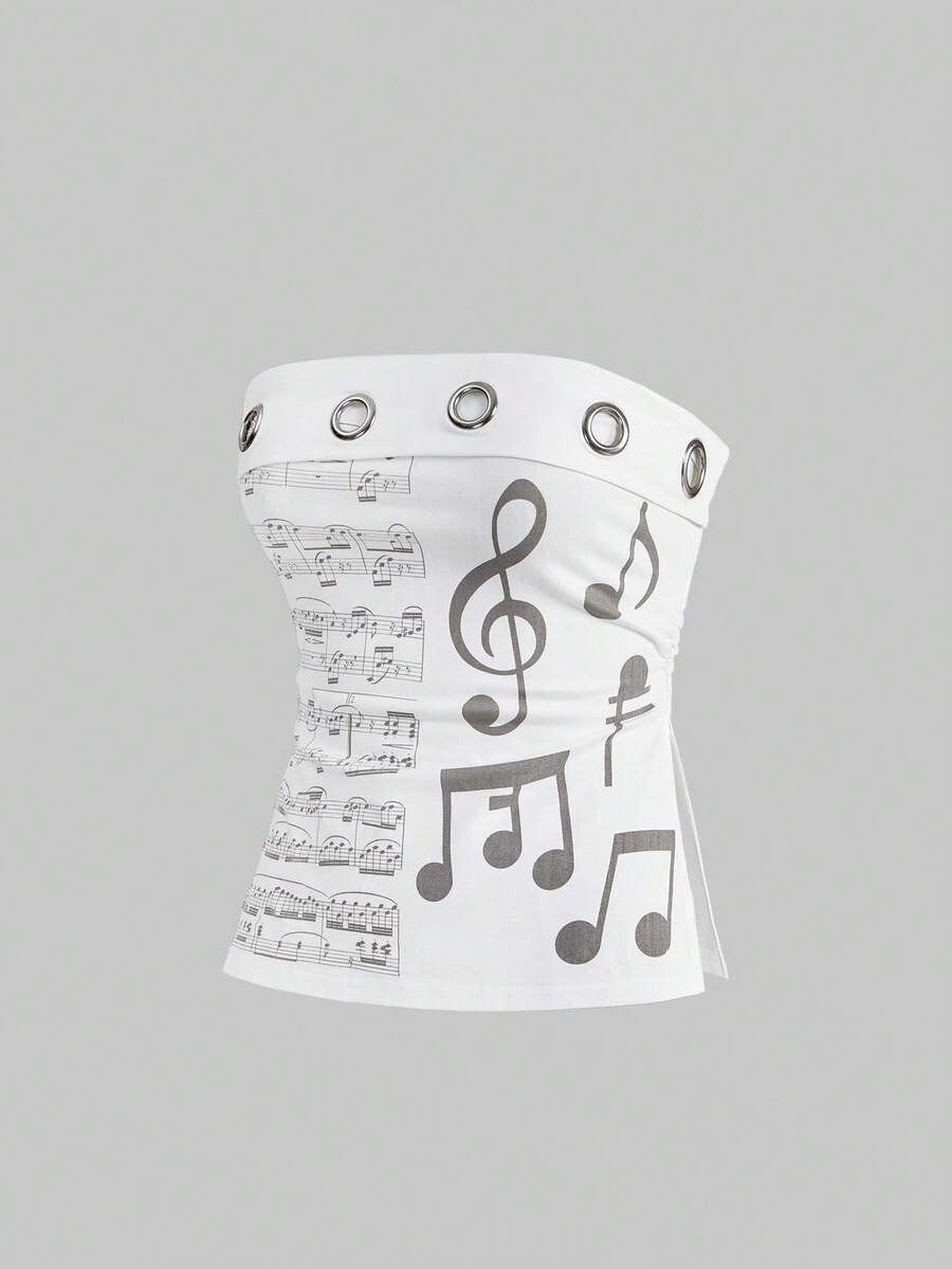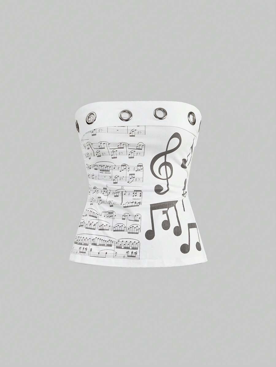 Grunge Punk Top a fascia da donna con stampa di note musicali, design con occhielli metallici e spacchi, aderente, in stile Y2K